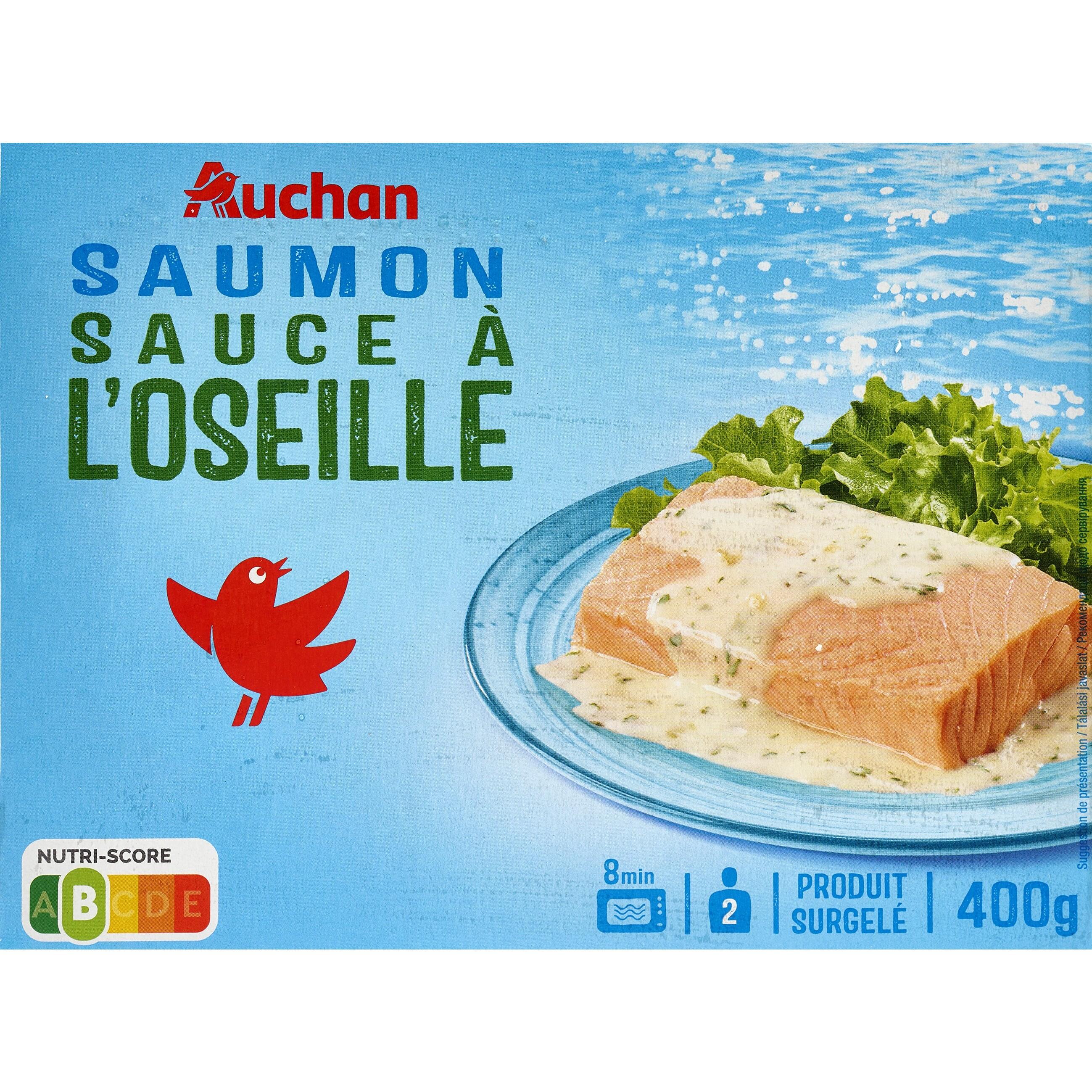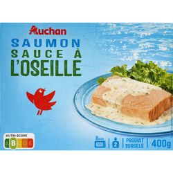 Portions de bloc de filets de saumon (50%) qualité sans arête* accompagnées d'une sauce à base d'oseille (50%), surgelées.