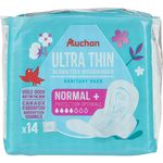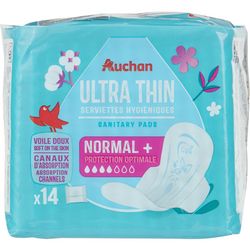 Restez fraîche toute la journée avec les serviettes hygiéniques Auchan ! Super absorbantes, elles vous offrent 8 heures de protection grâce à leur forme anatomique avec ailettes. Ultra fines et recouvertes d'un voile doux, elles vous garantissent un maximum de confort et de discrétion. Et grâce à leur emballage individuel sous pochettes, emportez-les partout avec vous !