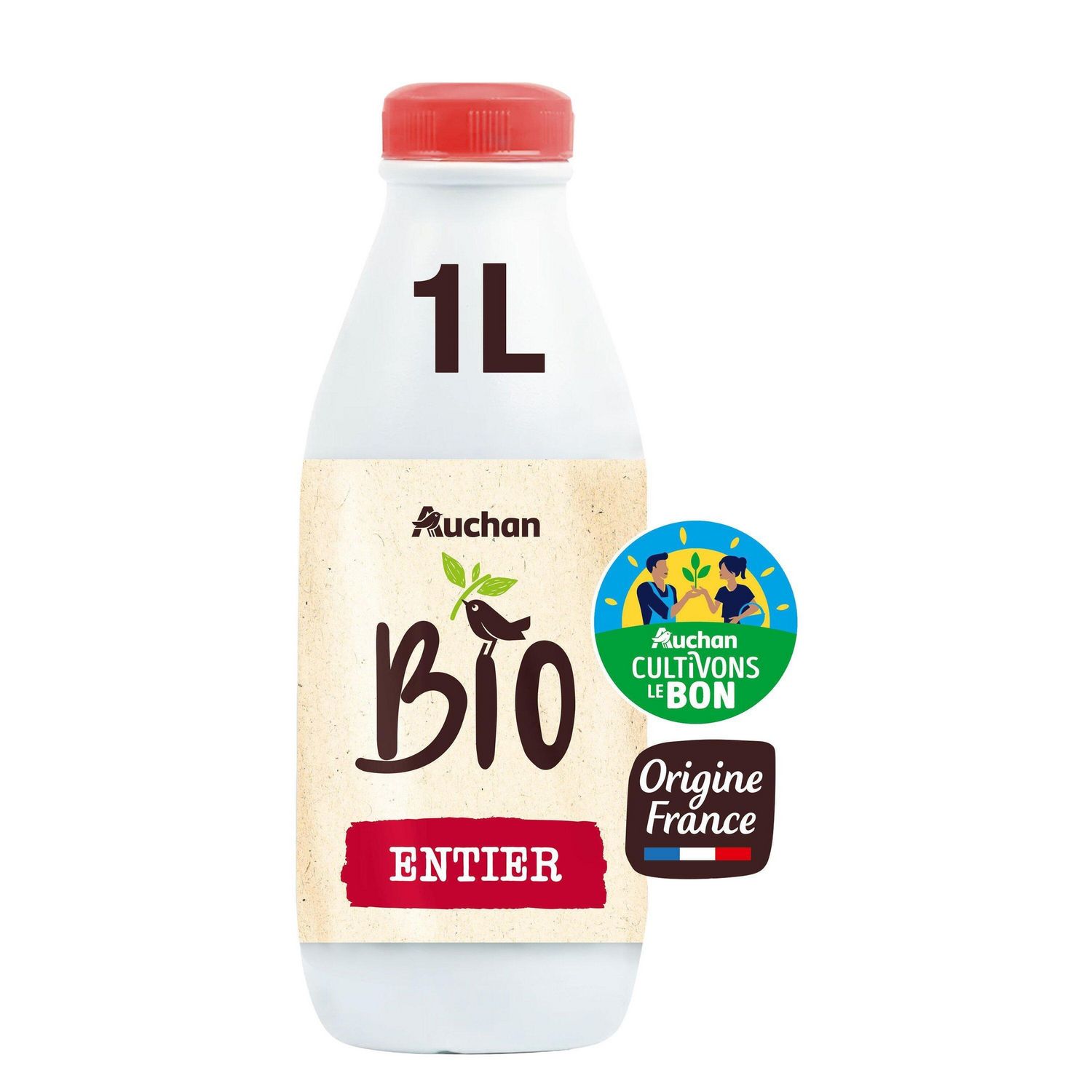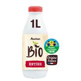 Un lait biologique, collecté et conditionné en France, entier, en bouteille en plastique 1L, Filière Responsable Auchan, "Solidaires" pour soutenir les producteurs avec une rémunération plus juste des éleveurs laitiers, provenant de vaches nourries sans ogm (< 0,9%) et au pré 250 jours en moyenne par an