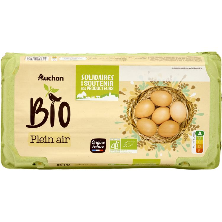 18 œufs de catégorie A de poules élevées en plein air biologiques* (code commençant par 0 sur l’œuf), calibre Moyen ou Gros* Conformément au mode de production biologique.