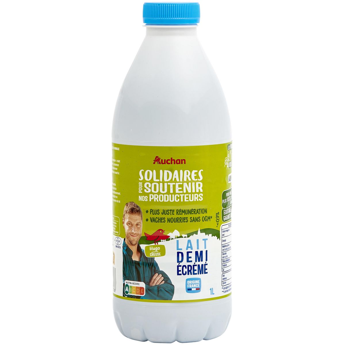 Un lait, collecté et conditionné en France, demi-écrémé, en bouteille en plastique 1L, Filière Responsable Auchan, équitable et "Solidaires" pour soutenir les producteurs avec une rémunération plus juste des éleveurs laitiers, provenant de vaches nourries sans ogm (< 0,9%) et au pré 120 jours minimum par an