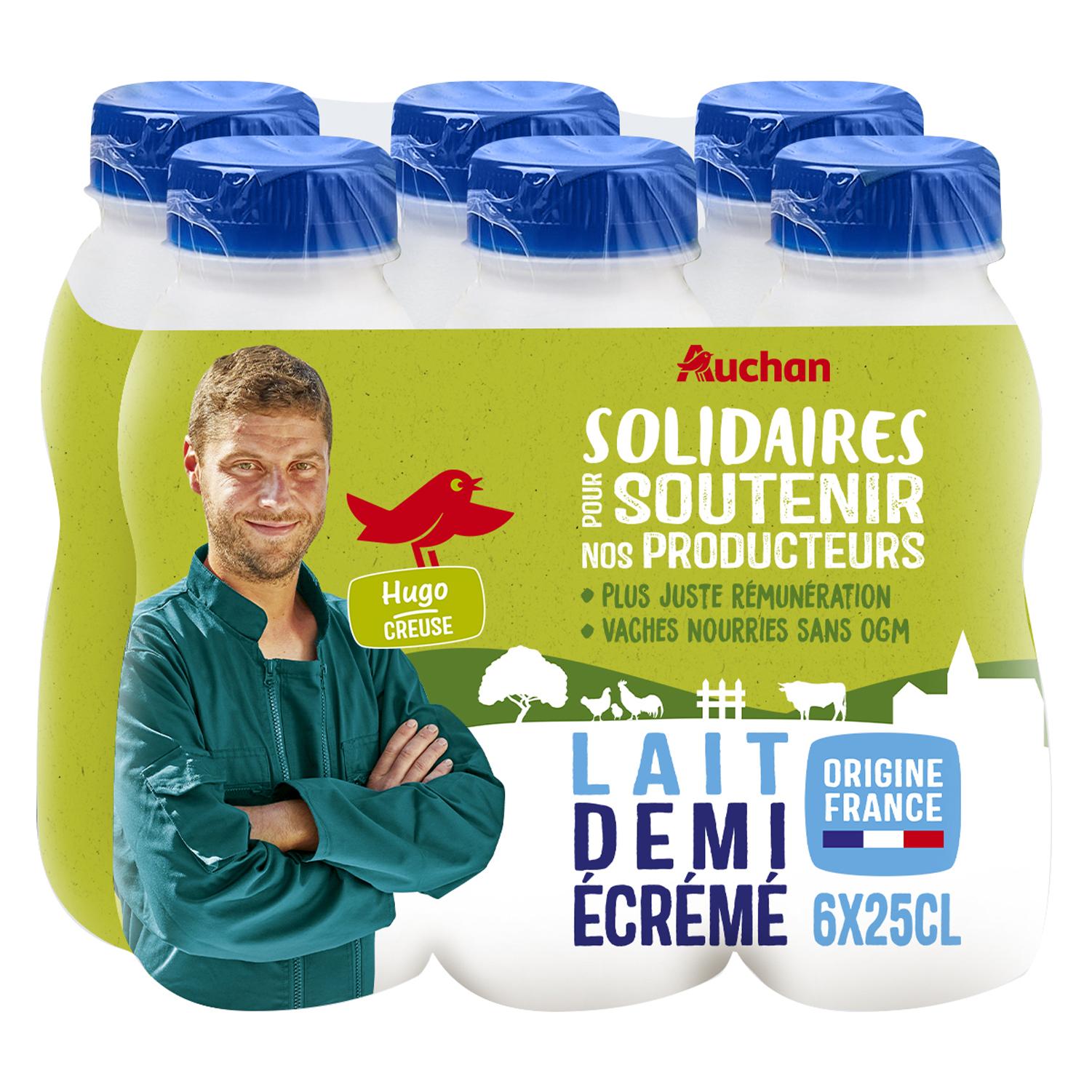 Un lait, collecté et conditionné en France, demi-écrémé, en petites bouteilles en plastique 6x25cl, Filière Responsable Auchan, équitable et "Solidaires" pour soutenir les producteurs avec une rémunération plus juste des éleveurs laitiers, provenant de vaches nourries sans ogm (< 0,9%) et au pré 120 jours minimum par an