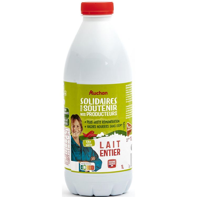 Un lait, collecté et conditionné en France, entier, en bouteille en plastique 1L, Filière Responsable Auchan, équitable et "Solidaires" pour soutenir les producteurs avec une rémunération plus juste des éleveurs laitiers, provenant de vaches nourries sans ogm (< 0,9%) et au pré 120 jours minimum par an