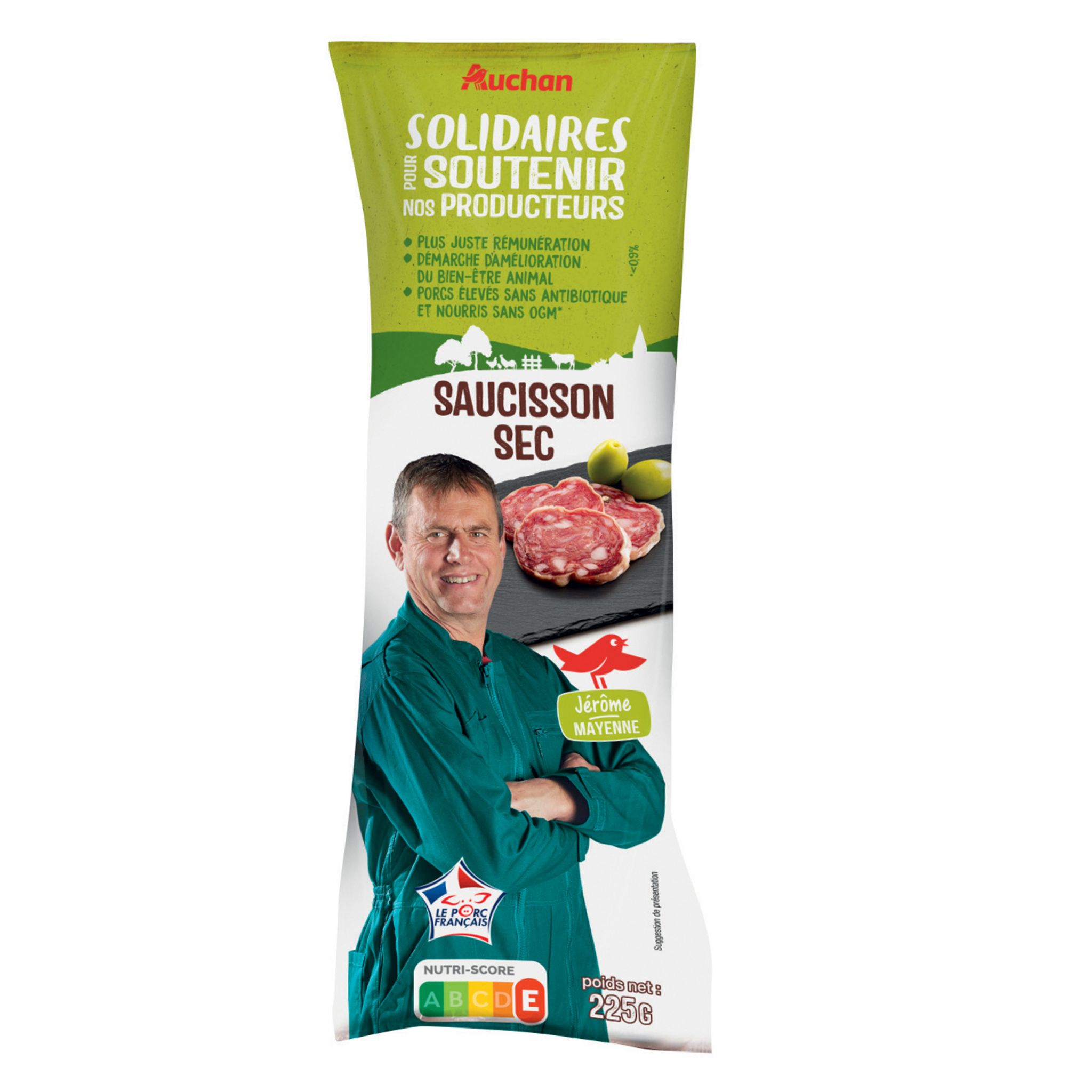 Ce produit de charcuterie est issu d'élevages français, engagés dans la filière "Bien Produire Bien Consommer" qui a pour vocation de garantir le bien être des porcs, sans traitement antibiotiques, nourris sans OGM, dont la nourriture est produite pour partie autour de la ferme. Par ailleurs, Auchan