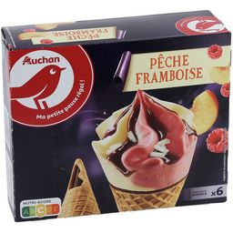 Sorbet framboise (36,6%), sorbet pêche (36,5%), gaufrette (13,2%), pâte à glacer au cacao maigre (6,9%), sauce aux fruits rouges, aromatisée (4,1%), copeaux de chocolat blanc (2,7%), surgelés