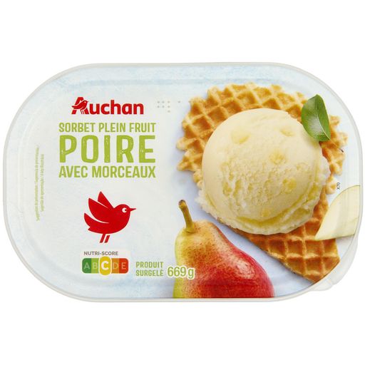 Sorbet plein fruit poire 93,3%, préparation de morceaux de poire 6,7%, surgelé