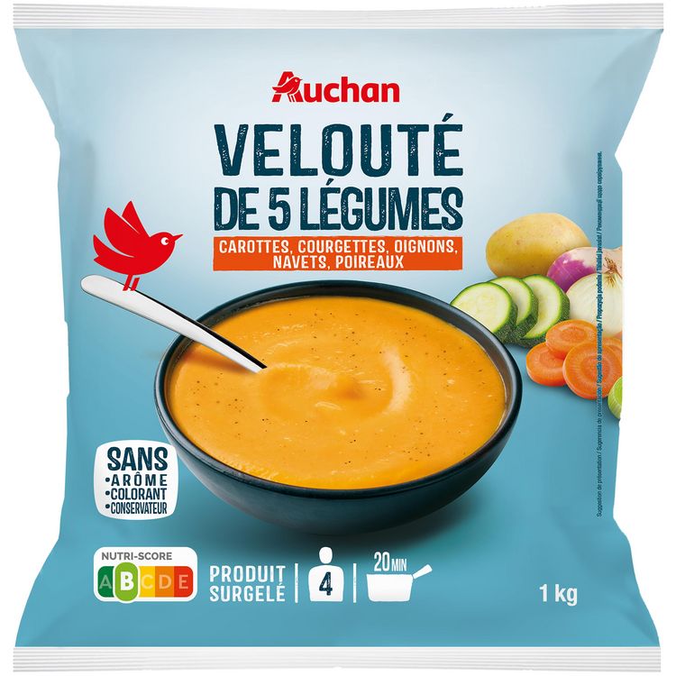 Ingrédients : Légumes 44% (carottes 19%, courgettes 14%, oignons 5,2% , navets 3,8% , poireaux 2%), eau, pomme de terre, crème (LAIT), beurre (LAIT), sel, poivre blanc.