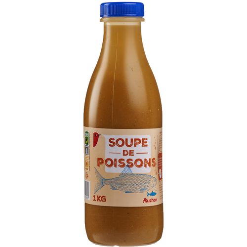 Eau, divers poissons 25%, concentré de tomates, carottes, oignons, vin blanc, amidon transformé de pomme de terre, poireaux, sel, céleri, persil, ail, huile de tournesol, épices et herbes aromatiques.Traces possibles de gluten, oeuf, soja, lait, moutarde, mollusques et crustacés.