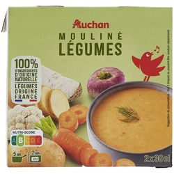 Ingrédients : Eau, pomme de terre 15,9%, carotte 15,6%,babeurre (LAIT), CÉLERI-rave 4,2%,chou-fleur 4,2%, navet 4,2%, oignon 4,2%, poireau 3,1%, haricot vert 1%, beurre(LAIT),sel, persil, arôme naturel de CÉLERI-rave,arôme naturel. TENEUR EN LÉGUMES : 52,7% Élaboré à partir de légumes et de lait origine France.