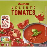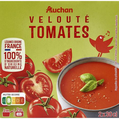 Ingrédients : Eau, purée de tomate reconstituée 36%, carotte, pomme de terre, amidon de maïs, sucre, oignon, sel, crème (LAIT), beurre (LAIT), basilic 0,2%, ail, origan 0,05%. Teneur en légumes : 57%Élaboré à partir de légumes et lait origine France.