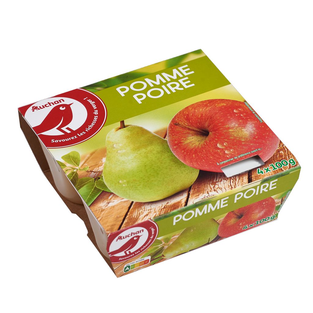 Ingrédients : Purée de pommes 65,7%, purée de poires 28%, sucre 6.3%, antioxydant: acide ascorbique.