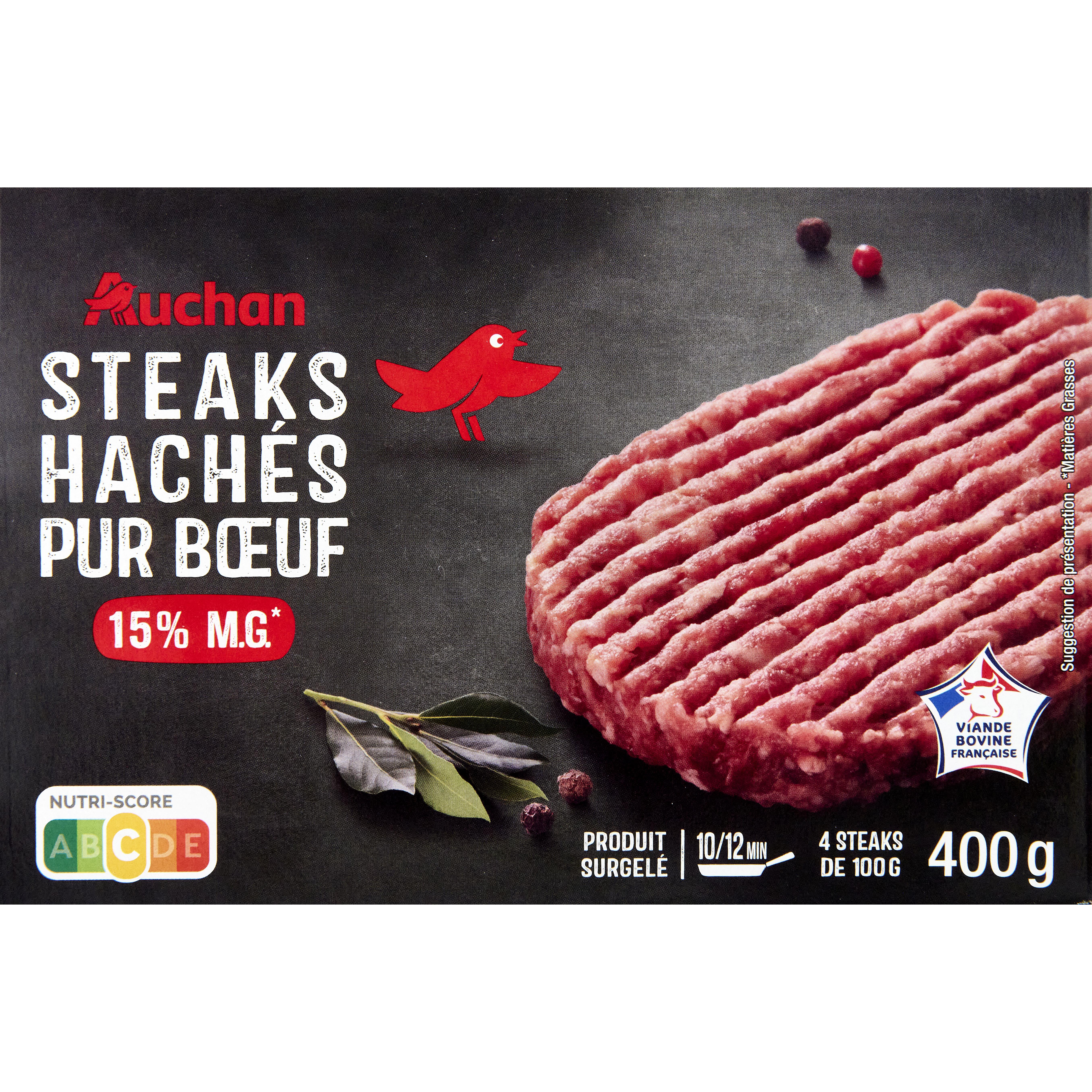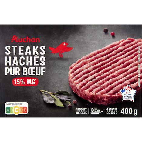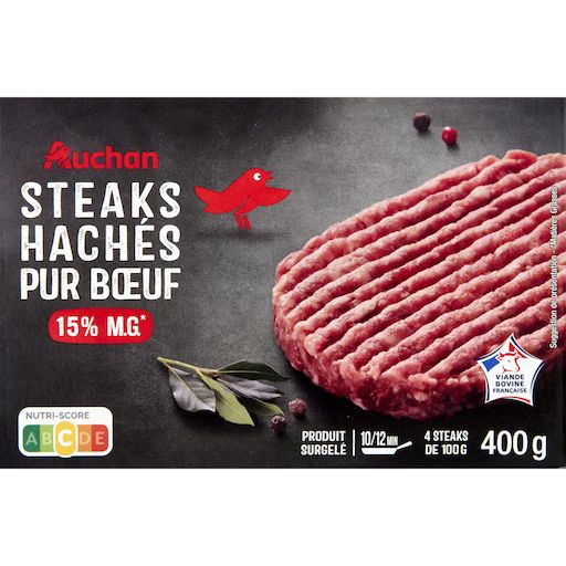 AUCHAN STEAKS HACHÉS PUR BŒUF 15% MG X4 400 GR