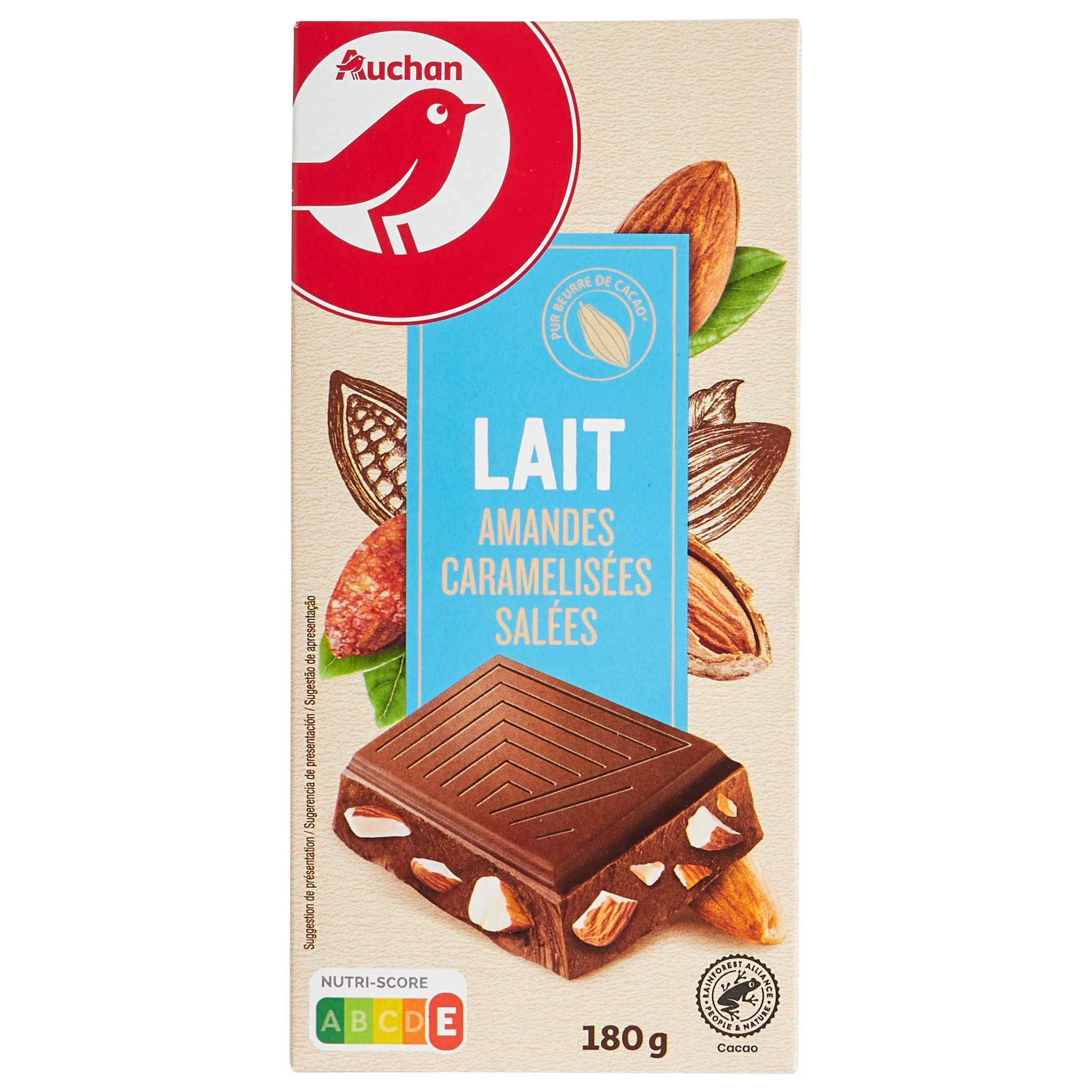 Chocolat au lait aux éclats d'amandes hachées caramélisées salées. Pur beurre de cacao.