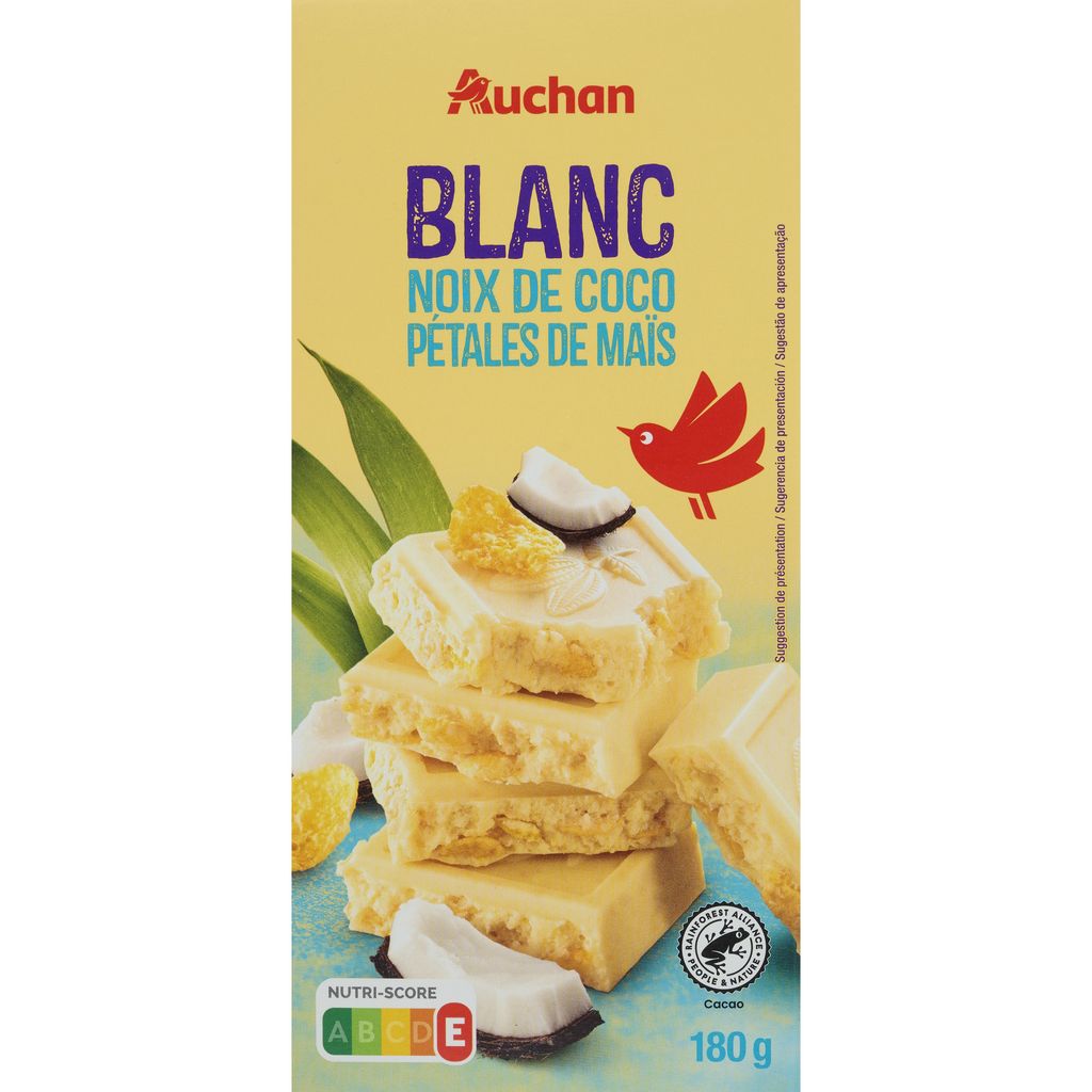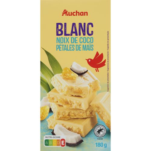 Laissez-vous tenter par le chocolat blanc Auchan, une gourmandise exotique où la douceur du chocolat rencontre la saveur tropicale de la noix de coco et le croustillant des pétales de maïs. Un plaisir unique à savourer, idéal pour une pause gourmande et originale. Format 180g.