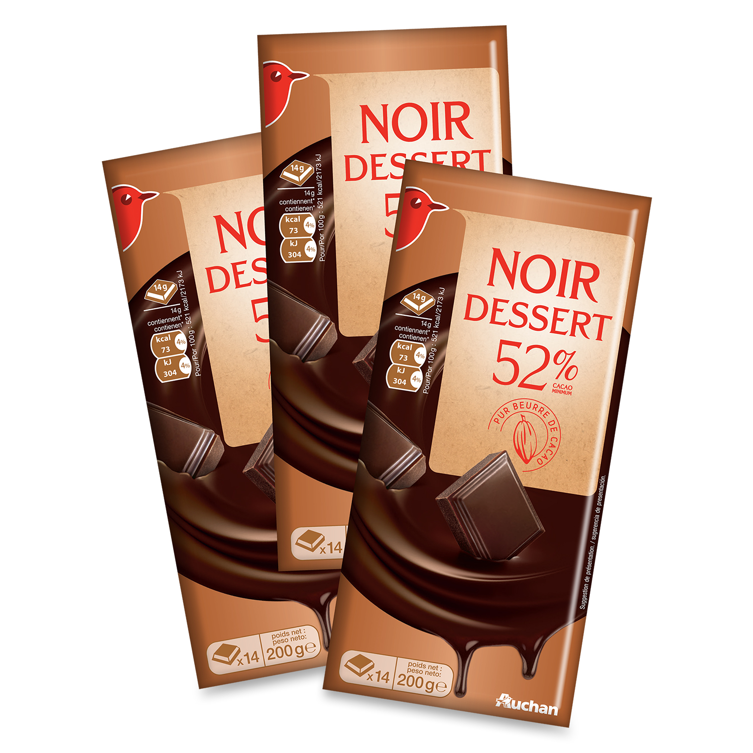 Pâte de cacao, sucre, beurre de cacao, émulsifiant : lécithines (tournesol), arôme vanille. Traces éventuelles de fruits à coque, de gluten et de lait. Cacao : 52% minimum.