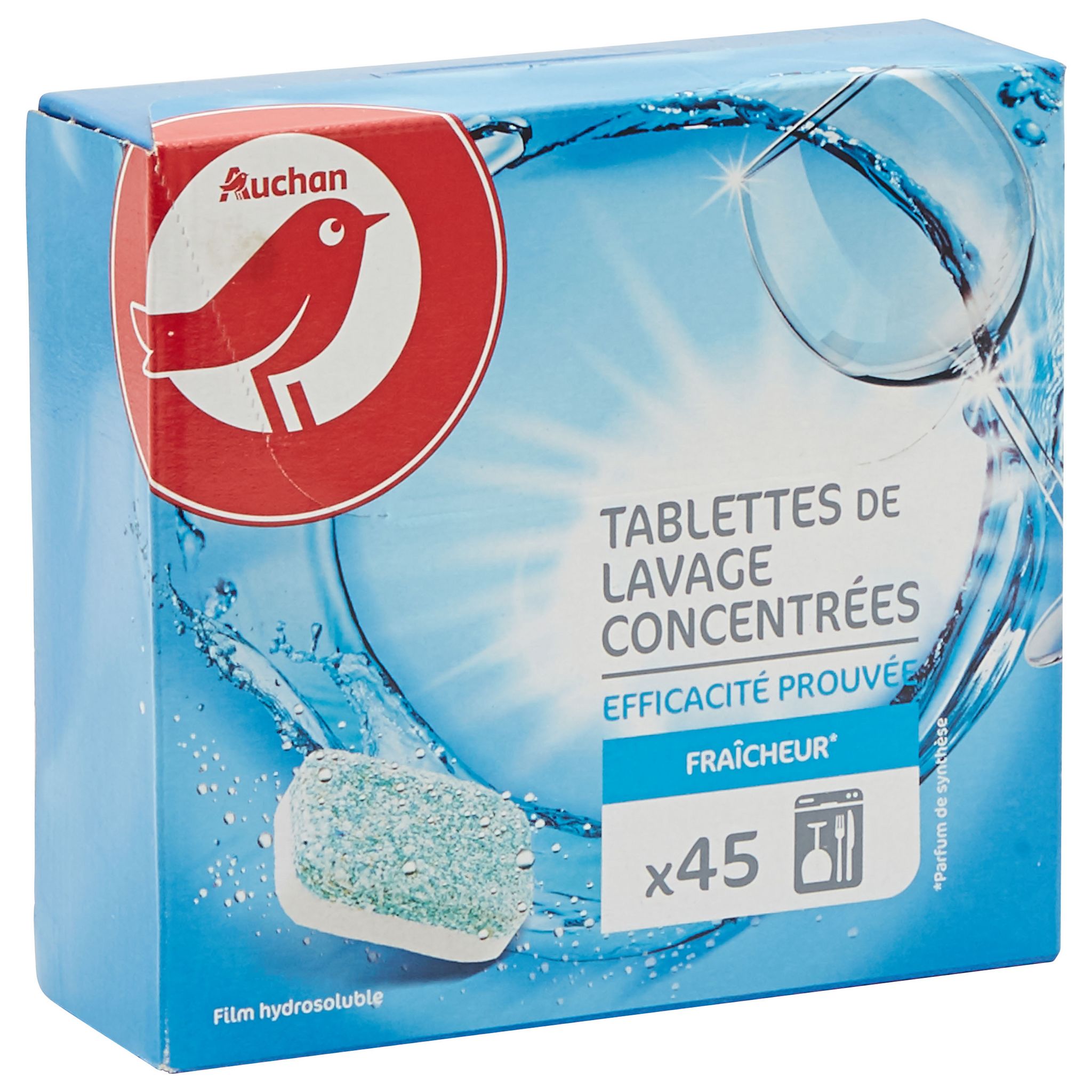 J'utilisais les tablettes de lave-vaisselle de chez Lidl, j'ai voulu changer en testant les tablettes de Auchan. Au premier lavage, la tablette était en miette au fond du lave vaisselle avec ma vaisselles toujours sale. Le deuxième essai pareil. Je n'ai pas insisté et reprit une boîte de la marque lidl et premier lavage impeccable. Donc le constat est fait, pour moin cher je choisi lidl.