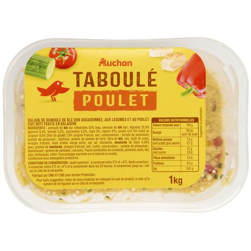 Ingrédients : Semoule de BLÉ dur réhydratée 52% (eau, semoule de BLÉ dur), légumes 25,8% (poivron 8,4%, tomate 5,2%, concombre 5,2%, maïs 5%, oignon 2%), poulet cuit rôti traité en salaison 9,6% [filet de poulet 7,6% (origine France), eau, conservateurs : lactate de potassium, acétate de potassium dextrose, amidon de pomme de terre, fibre de BLÉ, sel], huile de colza, vinaigre d'alcool, huile d'olive vierge extra, sel, ail, ciboulette, MOUTARDE de Dijon 0,24% (eau, graines de MOUTARDE, vinaigre d'alcool, sel), cumin, conservateur : sorbate de potassium épaississant : gomme de xanthane curcuma. Traces éventuelles de crustacés, poissons, œufs, lait, soja, mollusques, céleri. Pourcentages exprimés sur le total de la recette.