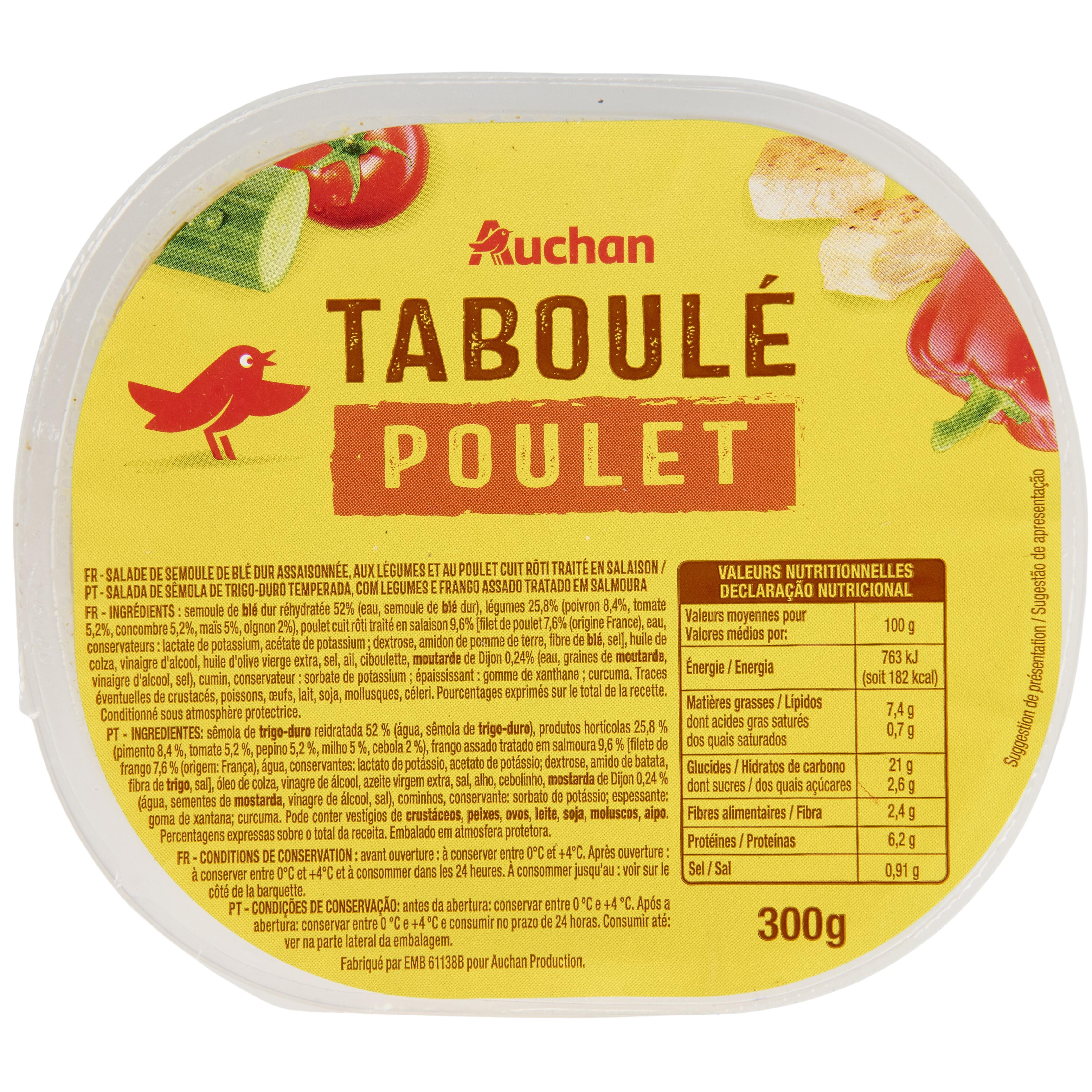 Ingrédients : Semoule de BLÉ dur réhydratée 52% (eau, semoule de BLÉ dur), légumes 25,8% (poivron 8,4%, tomate 5,2%, concombre 5,2%, maïs 5%, oignon 2%), poulet cuit rôti traité en salaison 9,6% [filet de poulet 7,6% (origine France), eau, conservateurs : lactate de potassium, acétate de potassium dextrose, amidon de pomme de terre, fibre de BLÉ, sel], huile de colza, vinaigre d'alcool, huile d'olive vierge extra, sel, ail, ciboulette, MOUTARDE de Dijon 0,24% (eau, graines de MOUTARDE, vinaigre d'alcool, sel), cumin, conservateur : sorbate de potassium épaississant : gomme de xanthane curcuma. Traces éventuelles de crustacés, poissons, œufs, lait, soja, mollusques, céleri. Pourcentages exprimés sur le total de la recette.