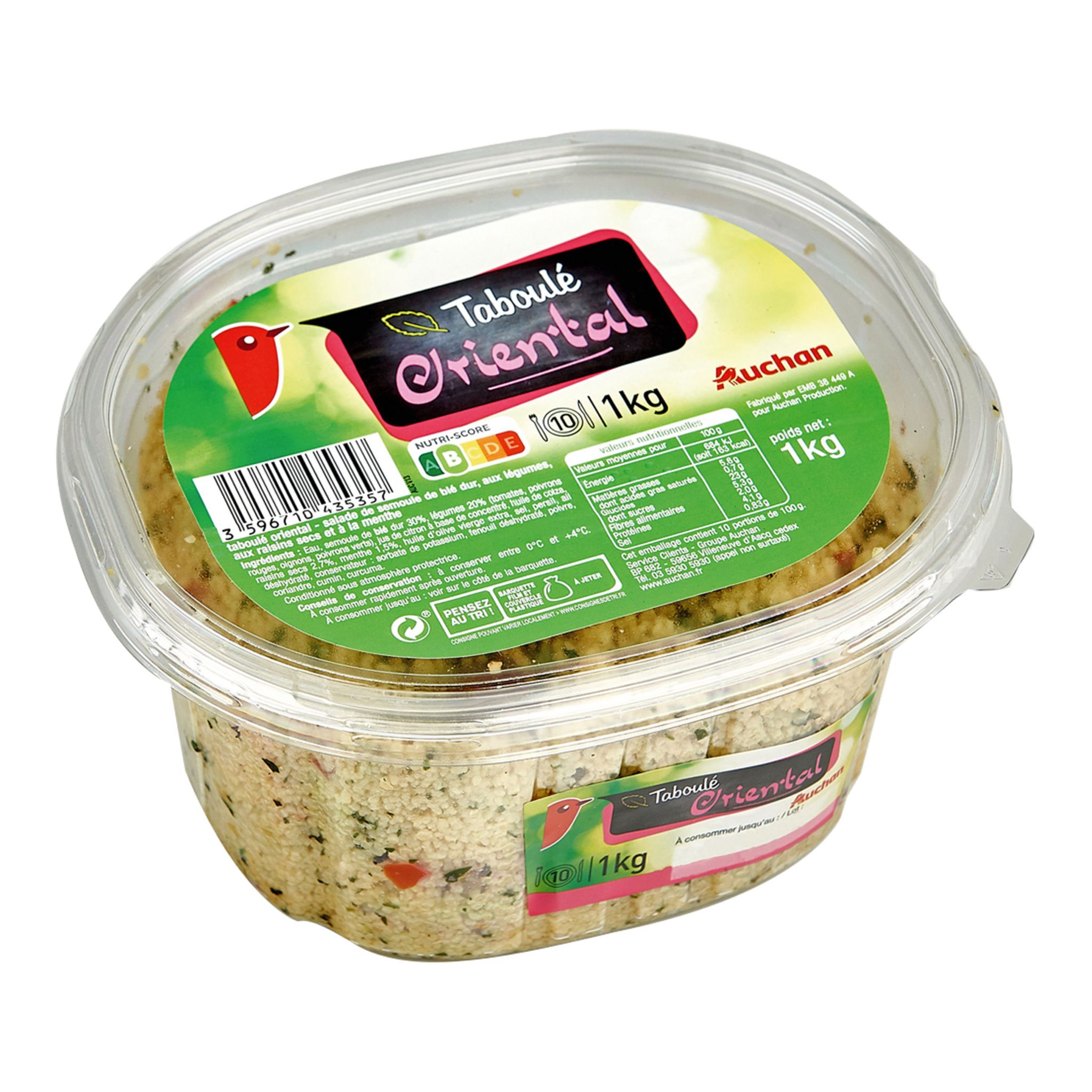 eau, semoule de blé dur30%, légumes 20% (tomates, poivrons rouges, oignons, poivrons verts),jus de citron à base de concentré, huile de colza, raisins secs 2,7%,menthe 1,5%, huile d'olive vierge extra, sel, persil, ail déshydraté,conservateur : sorbate de potassium, fenouil déshydraté, poivre,coriandre, cumin, curcuma.