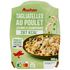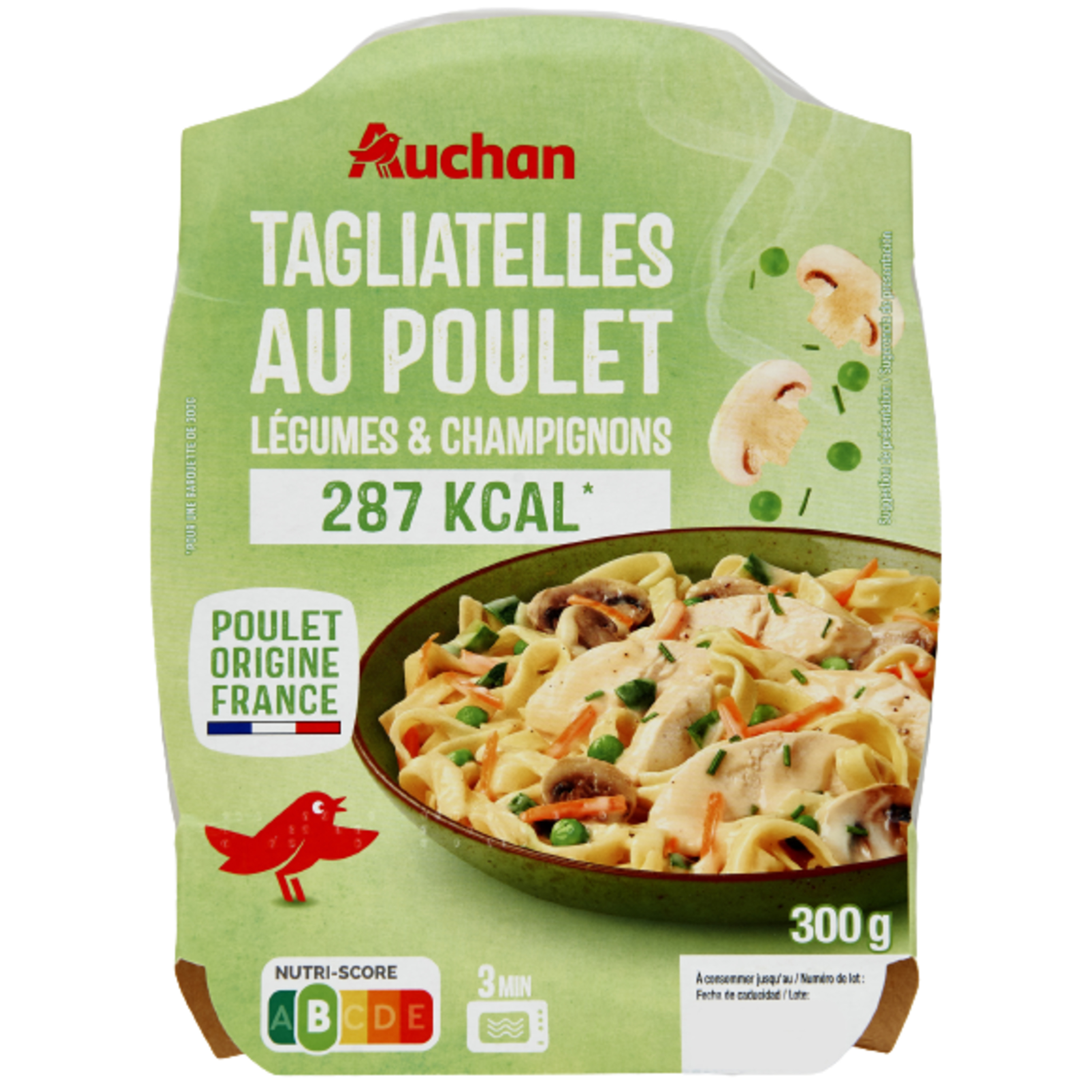 Ingrédients : Pâtes fraîches 31% (semoule de BLÉ dur, eau, ŒUFS entiers), viande de poulet rôtie cuite traitée en salaison 21,7% [viande de poulet 20,3%, eau, saumure (amidon de manioc, sel, dextrose)], eau, crème fraîche légère 8% (LAIT), carottes 6,3%, champignons de Paris et champignons de Paris déshydratés 5,4%, courgettes 3%, farine de BLÉ, petits pois 1,8%, amidon de maïs, fond de volaille (viande et jus de cuisson de volaille, sel), sel, ciboulette 0,3%, ail, arôme naturel, poivre. Pourcentages exprimés sur le total de la recette. Elaboré à partir de poulet origine France et de lait origine France. Traces éventuelles de soja, céleri.