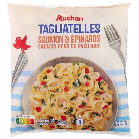 Ingrédients : Tagliatelles précuites 37% (eau, semoule de BLÉ dur, ŒUFS entiers en poudre, sel), saumon rose du Pacifique ou saumon Kéta du Pacifique (POISSON) 15%, eau, épinards 11%, crème liquide (LAIT), tomates 8%, jus de citron jaune, farine de riz, fumet de POISSON (eau, POISSON, sel, huile de tournesol, vin blanc, fibres d'agrumes, oignons en poudre), huiles végétales (contient tournesol et/ou colza), emmental (lait), échalote, vin blanc, sel, LAIT entier en poudre, poivre blanc. Traces éventuelles de moutarde. Malgré tout le soin apporté à la préparation de nos poissons, la présence exceptionnelle d'arête n'est pas exclue. nous vous recommandons de vérifier les bouchées destinées aux enfants en bas âge.