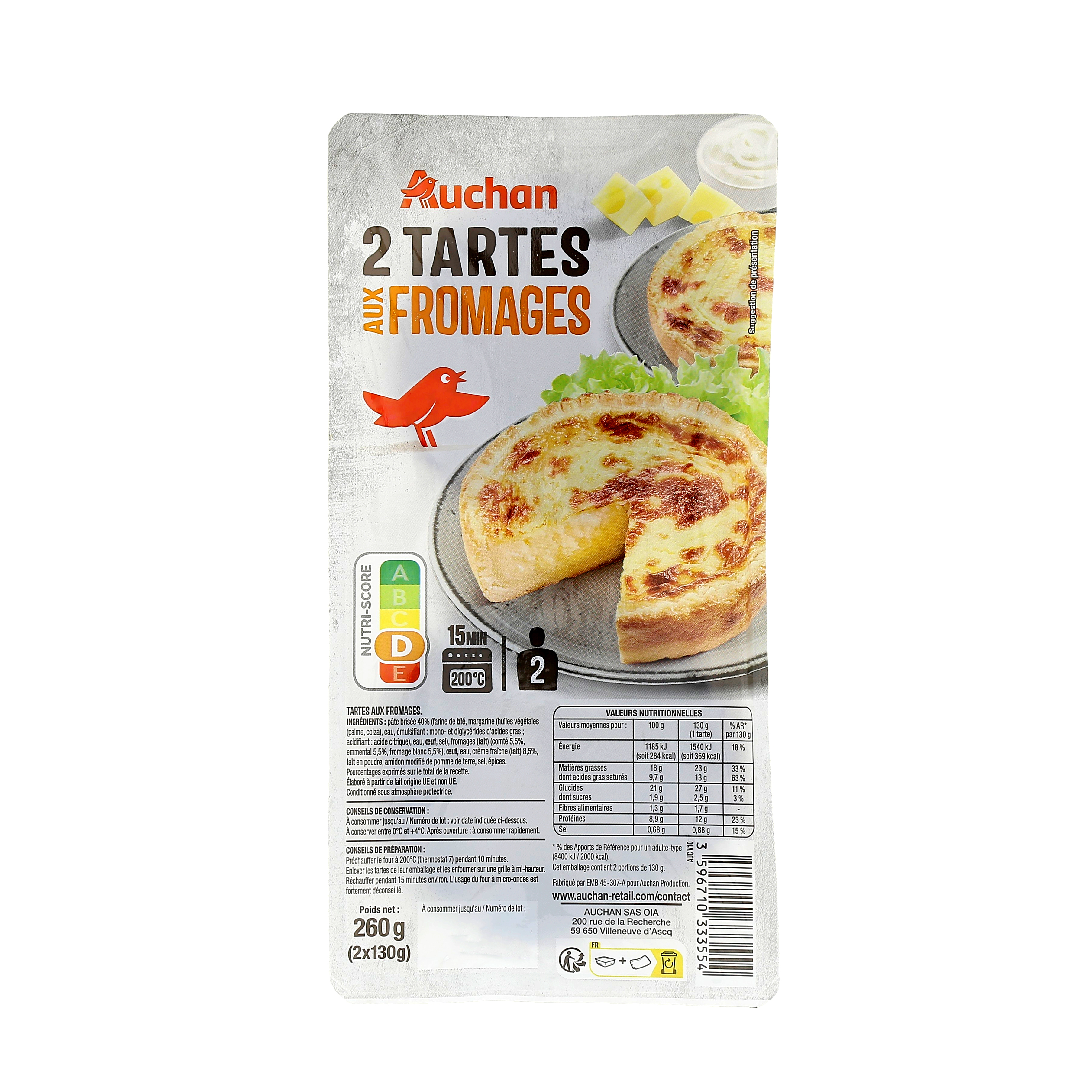 Ingrédients : Pâte brisée 40% (farine de blé, margarine (huiles végétales (palme, colza), eau, émulsifiant : mono- et diglycérides d'acides gras acidifiant : acide citrique), eau, œuf, sel), fromages (lait) (comté 5,5%, emmental 5,5%, fromage blanc 5,5%), œuf, eau, crème fraîche (lait) 8,5%, lait en poudre, amidon modifié de pomme de terre, sel, épices. Pourcentages exprimés sur le total de la recette.Élaboré à partir de lait origine UE et non UE.