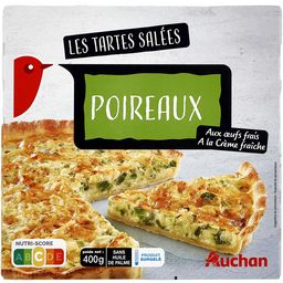 Ingrédients : Poireaux cuits 23%, farine de BLÉ, eau, crème fraîche (LAIT) 11,5%, emmental (LAIT) 8,3%, ŒUFS frais 7,3%, fromage blanc (LAIT), huile végétale de colza, farine de riz, fromage 1,5% (LAIT), préparation laitière (lactose (LAIT) et protéines de LAIT, LAIT écrémé en poudre), sel, amidon de maïs, paprika, poivre. Traces éventuelles de poisson, crustacés, mollusques, moutarde et céleri.Elaboré à partir de lait origine UE ou hors UE.