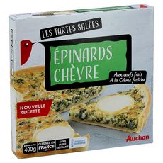 Garniture 62,5%: épinards 18%, crème fraiche (contient lait origine France) 14%, oeufs frais 10%, fromage de chèvre affiné (contient lait origine UE) 7.5%, eau, fromage de chèvre (contient lait origine UE) 3.7%, amidon de riz, sel, poivre. Pâte 37.5%: farine de blé (contient gluten), eau, huile végétale de colza, fécule de pomme de terre, oeufs frais 1,3%, farine de riz, poudre de lait (origine UE), sel.Pourcentages exprimés sur le total de la recette.Traces éventuelles de céleri et de moutarde.