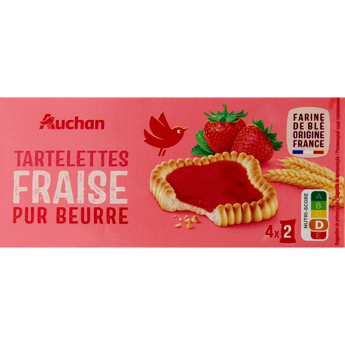 Ingrédients : Farine de blé 44% (origine France), sirop de glucose-fructose, purée de fraise 18%*, beurre concentré (équivalent beurre 11,5%), stabilisant : glycérol, sirop de glucose, sucre, purée concentrée de fraise 1,2%*, sel, arôme, gélifiant : pectines, œufs** en poudre, correcteur d’acidité : citrates de sodium poudres à lever : carbonates de sodium - carbonates d’ammonium acidifiant : acide citrique.*Equivalent fraise 25%.**Issus de poules élevées au sol.Traces éventuelles de fruits à coque et de soja.