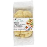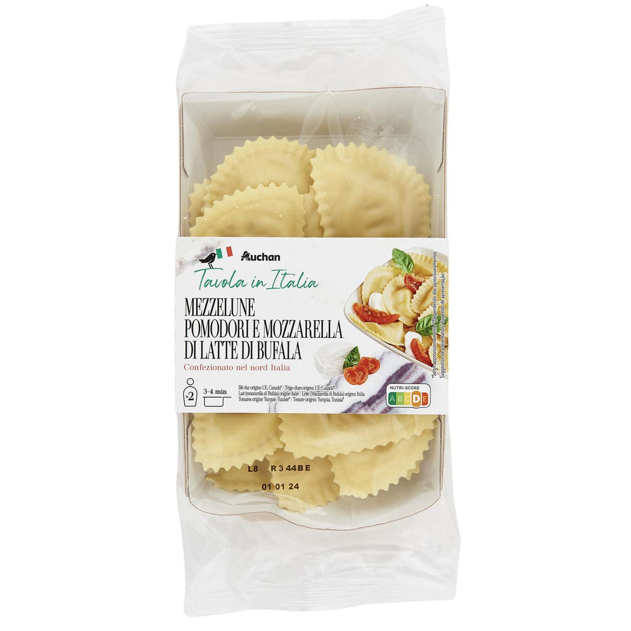 Ingrédients : Farce 60% : ricotta 16.3% (lactosérum ( LAIT origine UE), crème (LAIT origine UE), sel, correcteur d'acidité : acide citrique), tomates séchées marinées 9.4% (eau, végétale (huile de tournesol), tomates séchées 1.6%, jus de citron, ail, sel, origan 0.09%), mozzarella au LAIT de bufflonne 6.2% (LAIT origine Italie), mozzarella (LAIT origine UE), huile végétale (huile de tournesol), chapelure (farine de BLÉ , sel, levure), beurre (LAIt origine UE), crème (LAIT origine Italie), lactose (LAIT), fromage râpé (LAIT origine UE), sel. Pâte 40% : farine de BLÉ tendre 22,7% , ŒUFS 11,4% (soit 398g/kg de farine et semoule), semoule de BLÉ dur 5,9%.Pourcentages exprimés sur le total de la recette. Traces éventuelles de SOJA et MOUTARDE.