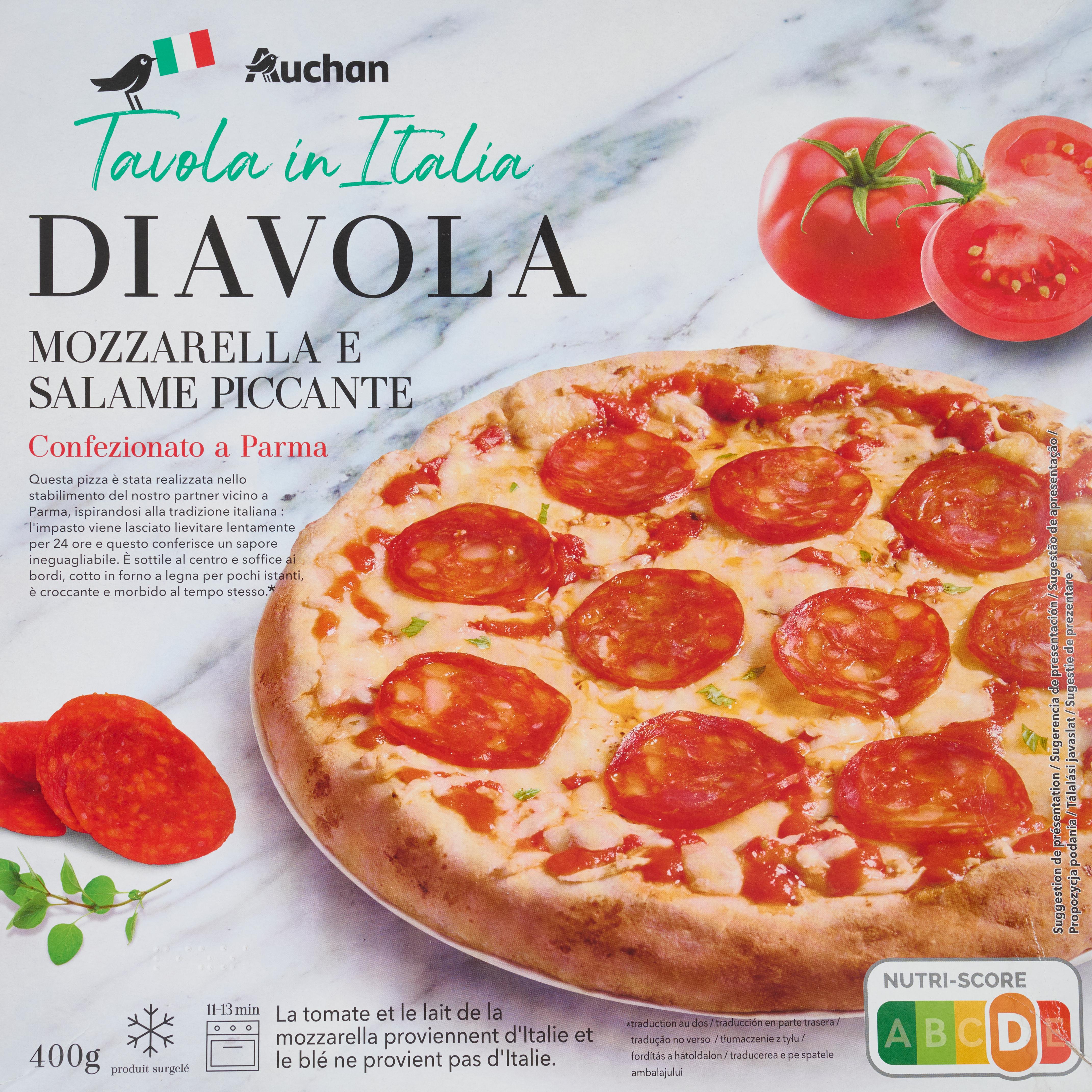 Pizza cuite au feu de bois garnie de mozzarella et salami piquant, surgelée