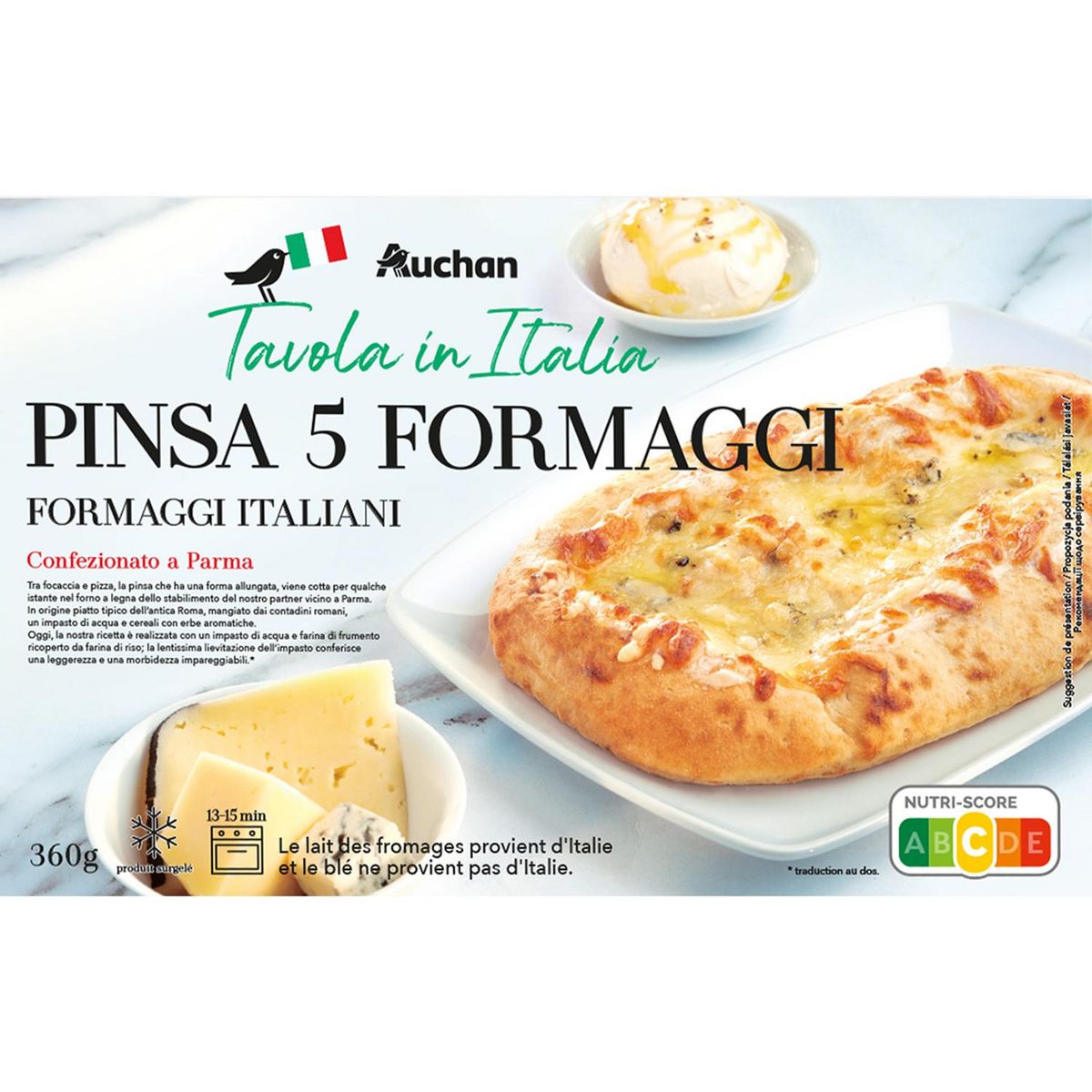 Pinsa précuite garnie de fromages (18,06%) et sauce au fromage (11,5%), surgelée.