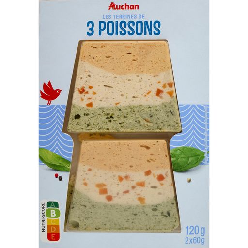 :Cet emballage contient 2 portions de 60 g Déguster cette délicieuse terrine de 3 poissons avec une sauce à base de fromage blanc et de ciboulette. Vous pouvez également l'accompagner de pousses de cresson et de tomates confites .