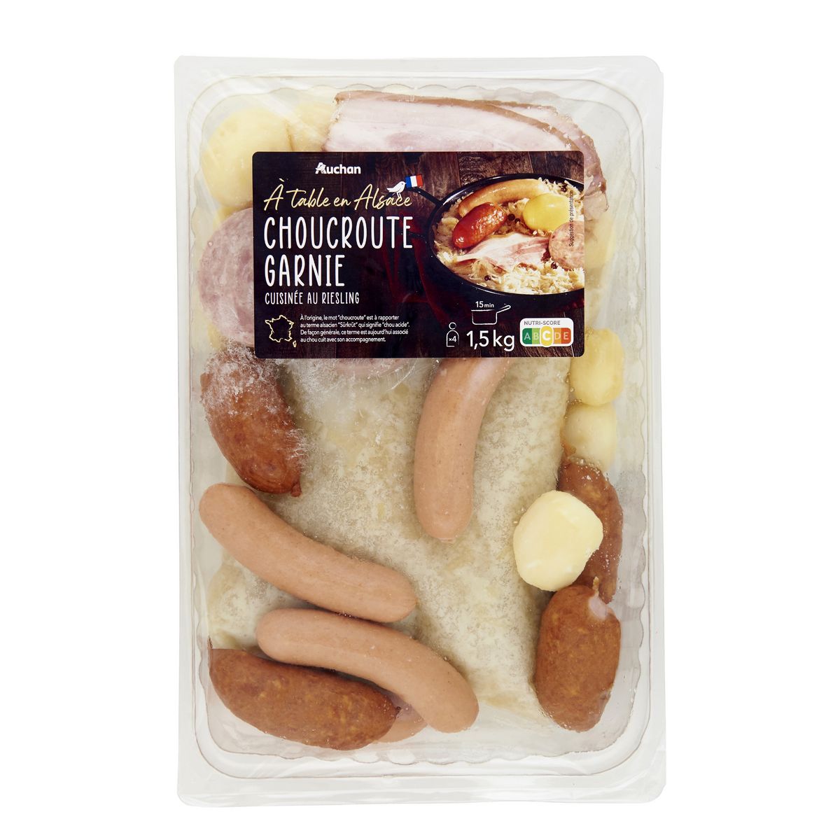 Ingrédients : Choucroute cuisinée au Riesling 57% : choux 43%, jus de cuisson, Riesling 1,1%, graisse de porc fondue, arôme naturel, sel, baies de genièvre 0,13%, antioxydant : acide ascorbique.Saucisse cuite fumée 11% : viande de porc 10%, eau, sel, épices et plantes aromatiques stabilisants : triphosphates, diphosphates dextrose antioxydant : acide ascorbique arômes naturels, conservateur : nitrite de sodium. Enveloppe : boyau naturel de porc.Knack 11% : viande de porc 5,9%, eau, gras de porc, viande bovine 0,4%, sel, arômes, épices et plantes aromatiques, dextrose, sirop de glucose, stabilisants : triphosphates, diphosphates antioxydants : acide érythorbique, érythorbate de sodium, conservateur : nitrite de sodium. Enveloppe : boyau naturel de mouton. Pomme de terre cuite 11% : pomme de terre, sel, conservateur : DISULFITE de sodium.Poitrine de porc cuite fumée 6% : poitrine de porc traitée en salaison 5,9%, eau, sel stabilisants : triphosphates, diphosphates bouillon (eau, viande de porc, os de porc), sirops de glucose, dextrose, conservateur : nitrite de sodium, arômes.Saucisson cuit à l'ail 4% : viande de porc 3,3%, eau, sel, plasma de porc, sirop de glucose, correcteur d'acidité : citrates de sodium, épices et plantes aromatiques, ail déshydraté 0,01%, dextrose, antioxydant : ascorbate de sodium, conservateur : nitrite de sodium.Pourcentages exprimés sur le total de la recette. Elaboré à partir de porc, de boeuf, de pomme de terre et de chou origine France.Traces éventuelles de gluten, lait, œufs, moutarde, soja, fruits à coque.