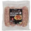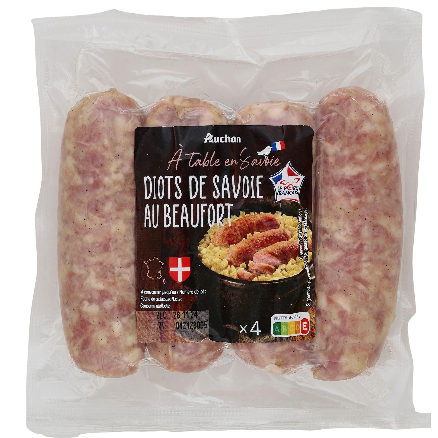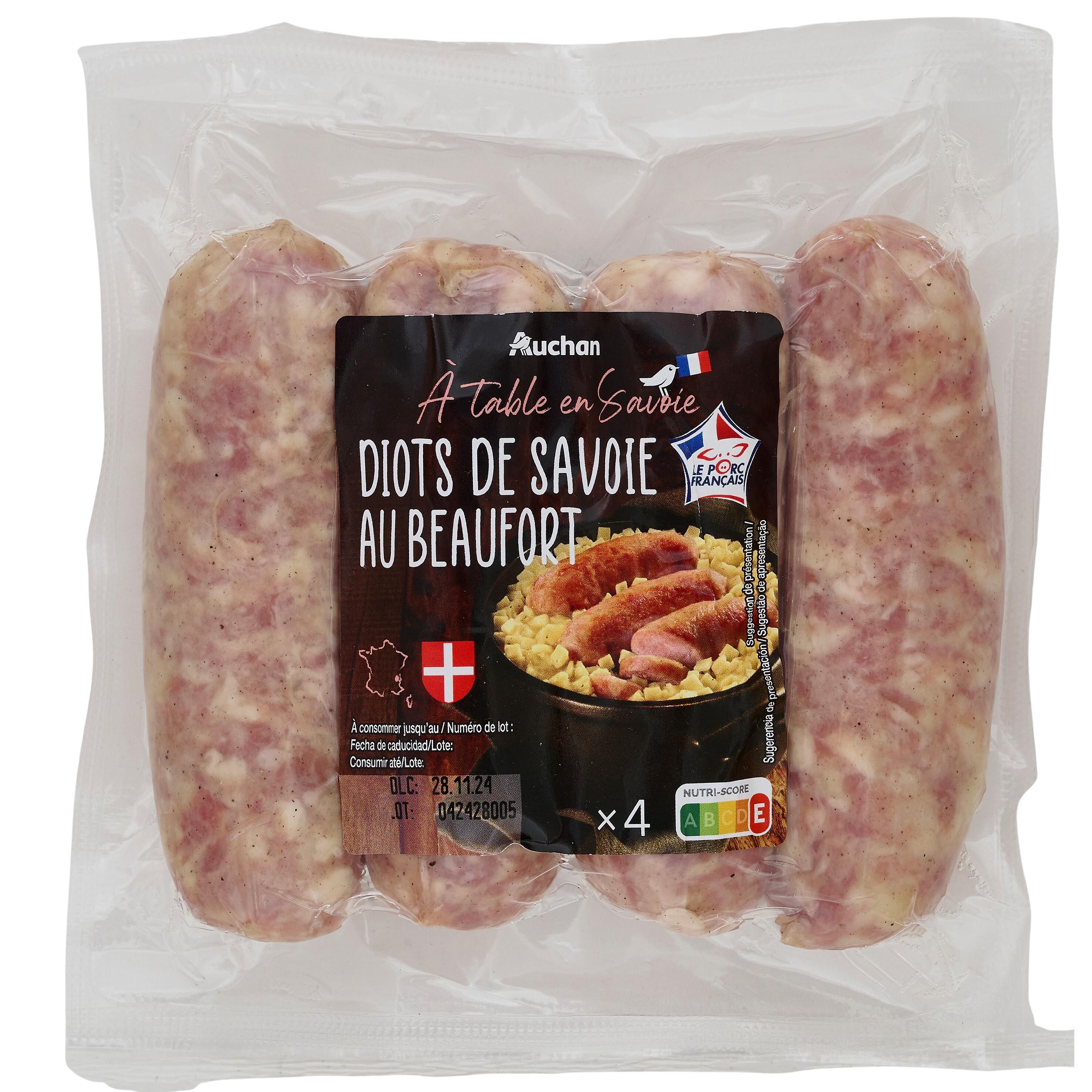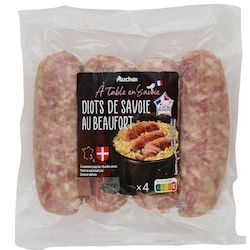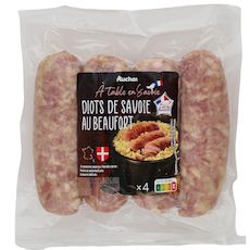 Ingrédients : Viande de porc (origine France), beaufort (LAIT origine France) 7,2%, eau, vin blanc, sel, lactose (LAIT origine UE), ail, poivre, muscade, épices (gingembre, cannelle, fenugrec, girofle), conservateur : nitrite de sodium, ferments (contient LAIT). Boyau naturel de porc. 80 g de viande de porc utilisée pour 100 g de produit fini.
