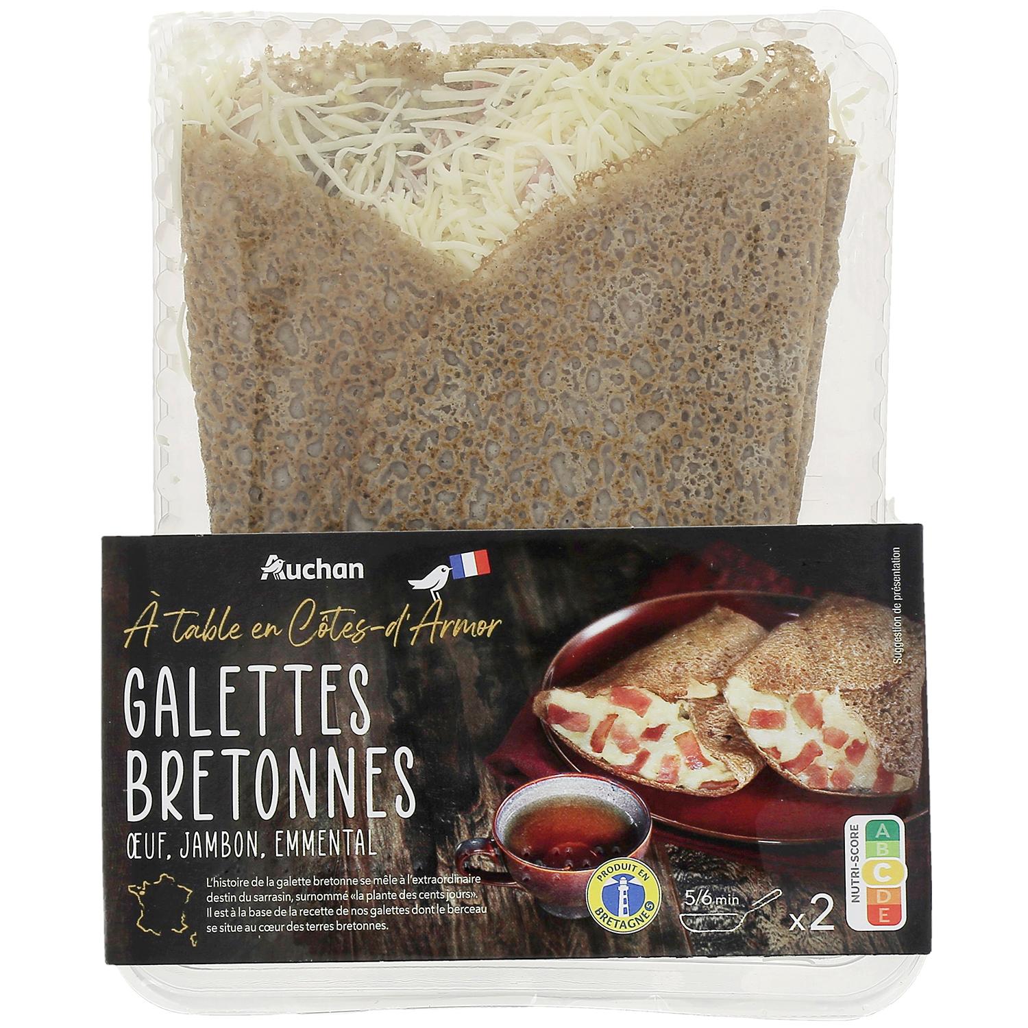 Ingrédients : Galette (50%) : Eau, farine de blé noir 16.5% (sarrasin origine France), sel de Guérande. Garniture (50%) : oeuf entier (origine France) 18.5%, jambon cuit supérieur décongelé** 14.2% (jambon de porc (origine France), sel, dextrose, arômes naturels, anti-oxydant : ascorbate de sodium, conservateurs : nitrite de sodium), emmental (lait) (origine France)11.4%, crème (crème (lait origine France), stabilisant : carraghénanes) 5.5%, sel, amidon modifié de pommes de terre, poivre. Pourcentages exprimés sur le total de la recette. ** Ne pas recongelerTraces éventuelles de gluten, poisson.