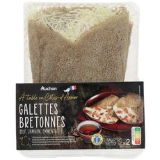 2 galettes garnies d'oeuf, de jambon cuit supérieur, d'emmental et de crème