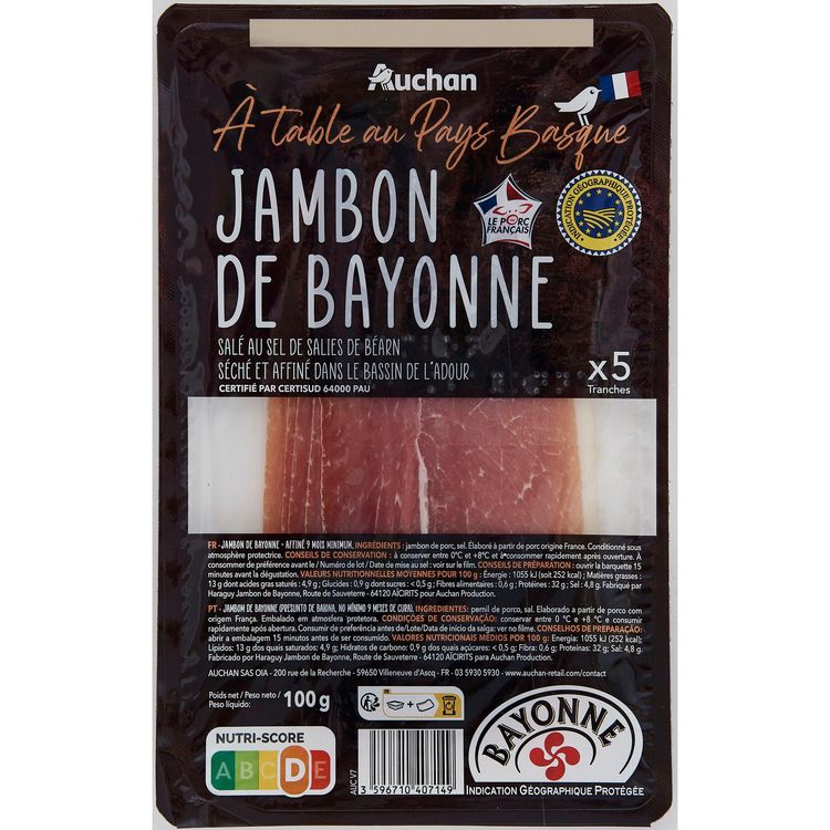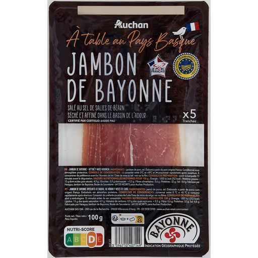 Découvrez notre Jambon de Bayonne IGP, un produit traditionnel français au goût authentique. Fabriqué à partir de viande de porc d'origine France, ce jambon est affiné pendant 9 mois dans le bassin de l'ADOUR, salé au sel sec de Salies sur Béarn,ce qui lui confère une saveur unique. Idéal pour vos apéritifs et vos sandwiches, profitez de tranches fines et savoureuses.