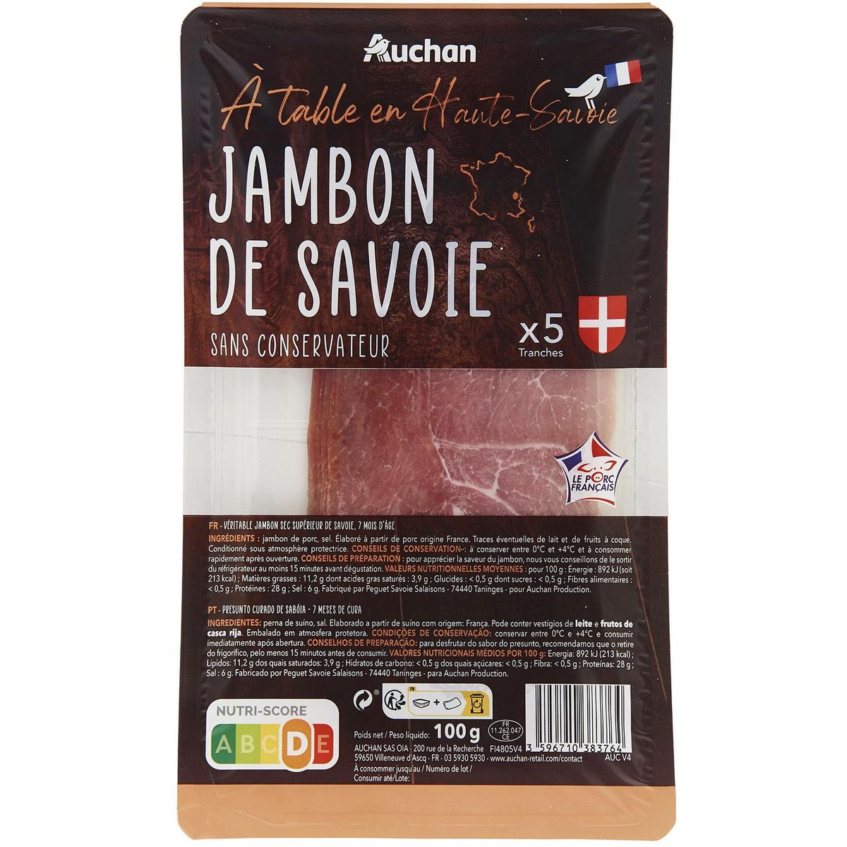 Ingrédients : Jambon de porc, sel. Elaboré à partir de porc origine France. Traces de lait et de fruits à coque.