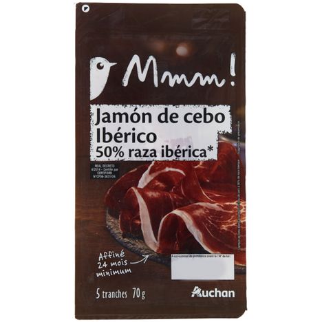 Ingrédients : Jambon de porc de cebo 50% ibérique (origine : Espagne), sel, sucre conservateurs : nitrate de potassium nitrite de sodium antioxydant : ascorbate de sodium. Elaboré à parti de porc origine Espagne