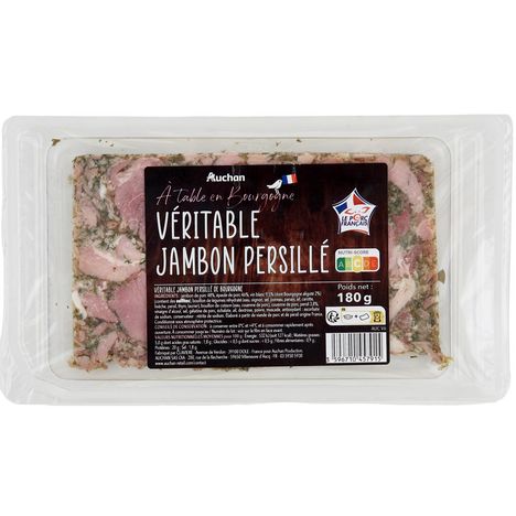 Ingrédients : Jambon de porc 48%, épaule de porc 46%, vin blanc 9,5% (dont Bourgogne aligoté 2%) (contient des SULFITES), bouillon de légumes réhydraté (eau, oignon, sel, poireau, panais, ail, carotte, livèche, persil, thym, laurier), bouillon de cuisson (eau, couenne de porc), couenne de porc, persil 3,8%, vinaigre d'alcool, sel, gélatine de porc, échalote, ail, dextrose, poivre, muscade, antioxydant : ascorbate de sodium, conservateur : nitrite de sodium. Elaboré à partir de viande de porc et de persil origine France.