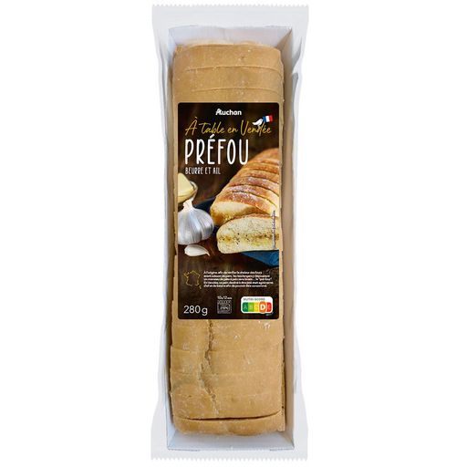Ingrédients : Pain 64,3% (farine de BLÉ, eau, huile d'olive, sel, levure, gluten de BLÉ, antioxydant : acide ascorbique), BEURRE (LAIT) 25%, ail 10%, sel, poivre. Pourcentages exprimés sur le total de la recette. Elaboré à partir de lait et d'ail origine France Traces éventuelles de poisson, oeuf, graines de sésame, moutarde et céleri.