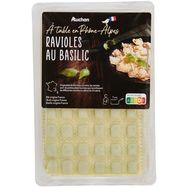 Ingrédients : Pâte 50% : farine de blé tendre (GLUTEN), eau, OEUFS frais 4,7%, huile de tournesol. Farce 50% : fromage blanc frais 14% (LAIT), fromage fondu (fromage (LAIT), amidon modifié de pomme de terre, lactosérum (LAIT), sel, arôme naturel), ricotta (LAIT), basilic 7,5%, emmental (LAIT), flocons de pomme de terre (pommes de terre déshydratées, extrait de curcuma), sel, beurre (LAIT). Pourcentages exprimés sur le total de la recette Elaboré à partir de lait origine UE et Suisse.