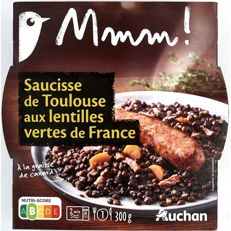 Ingrédients : Saucisse de Toulouse 31% (viande de porc origine UE, eau, sel, dextrose, acidifiant : acétate de sodium, arômes naturels, épices, conservateurs : érythorbate de sodium et nitrite de sodium), lentilles vertes de France précuites 28% (lentilles vertes de France, eau, huile de colza, sel), eau, lardons fumés 5% (poitrine de porc origine UE, eau, sel, dextrose, conservateurs : érythorbate de sodium et nitrite de sodium), carottes 4%, graisse de canard 3,7%, concentré de tomate, sucre, épaississants : gomme xanthane et gomme guar, oignon en poudre, poivre, thym. Traces éventuelles de poisson, gluten, oeuf et moutarde.