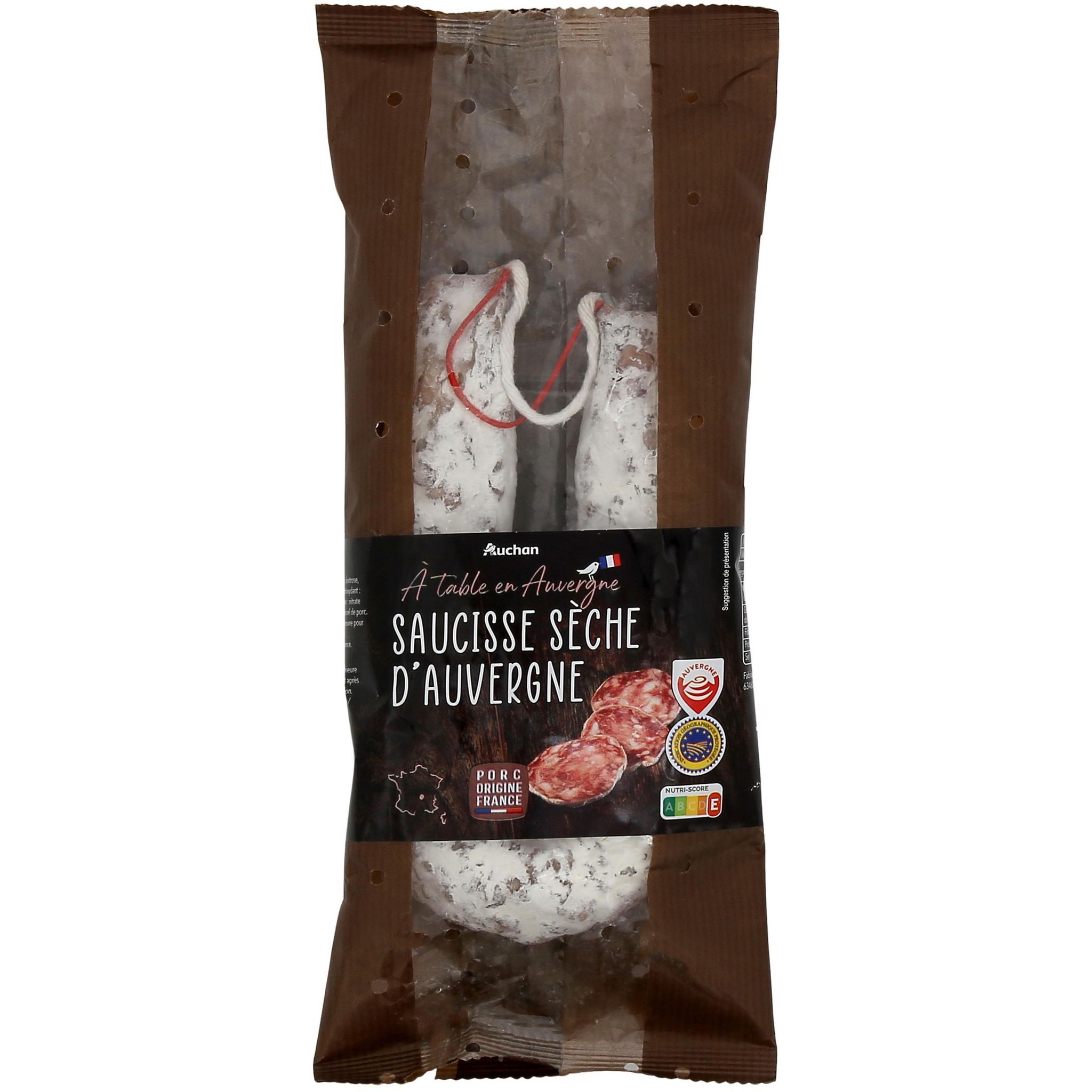 Saucisse sèche IGP Auvergne fabriqué avec de la viande de porc française, assaisonné d'un mélange d'épices sélectionnées avec soin, relevé d'une pointe d'ail, et séché de longues semaines au pied des volcans d'Auvergne.