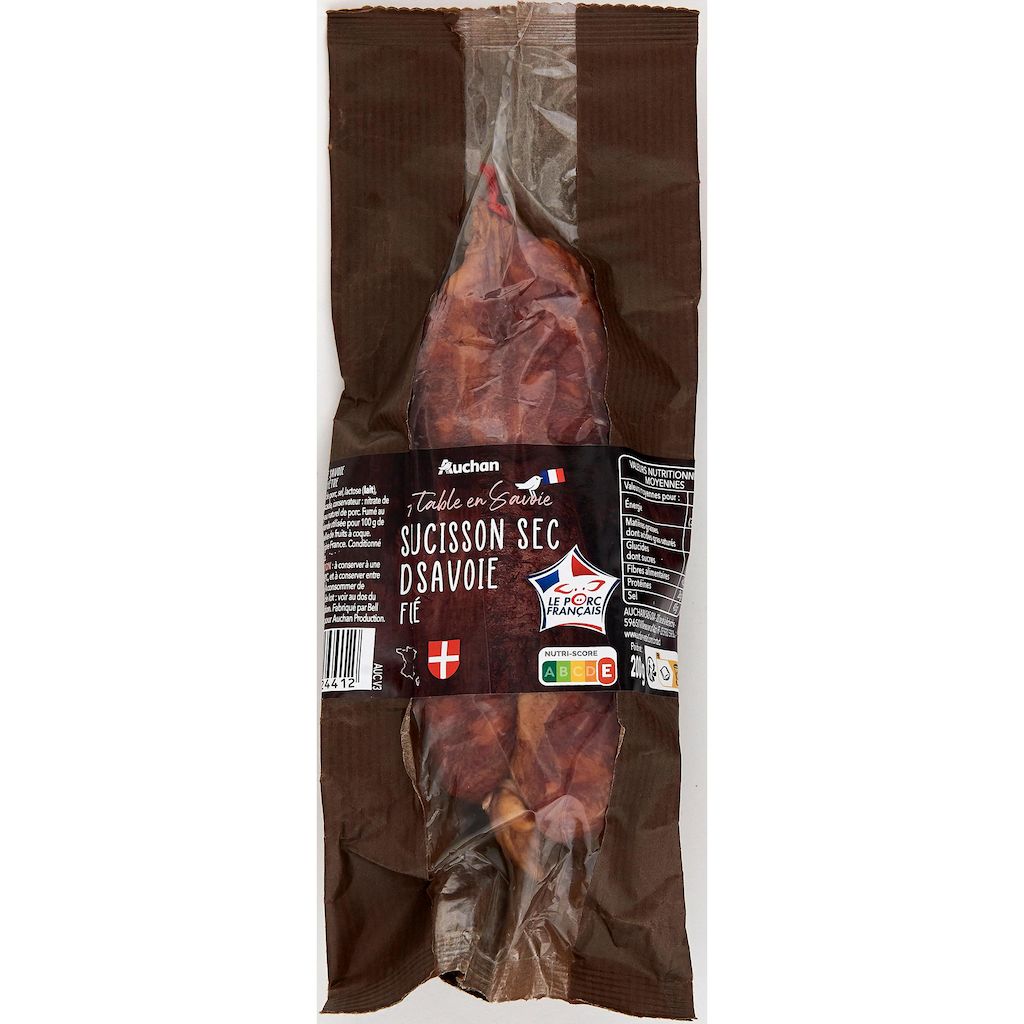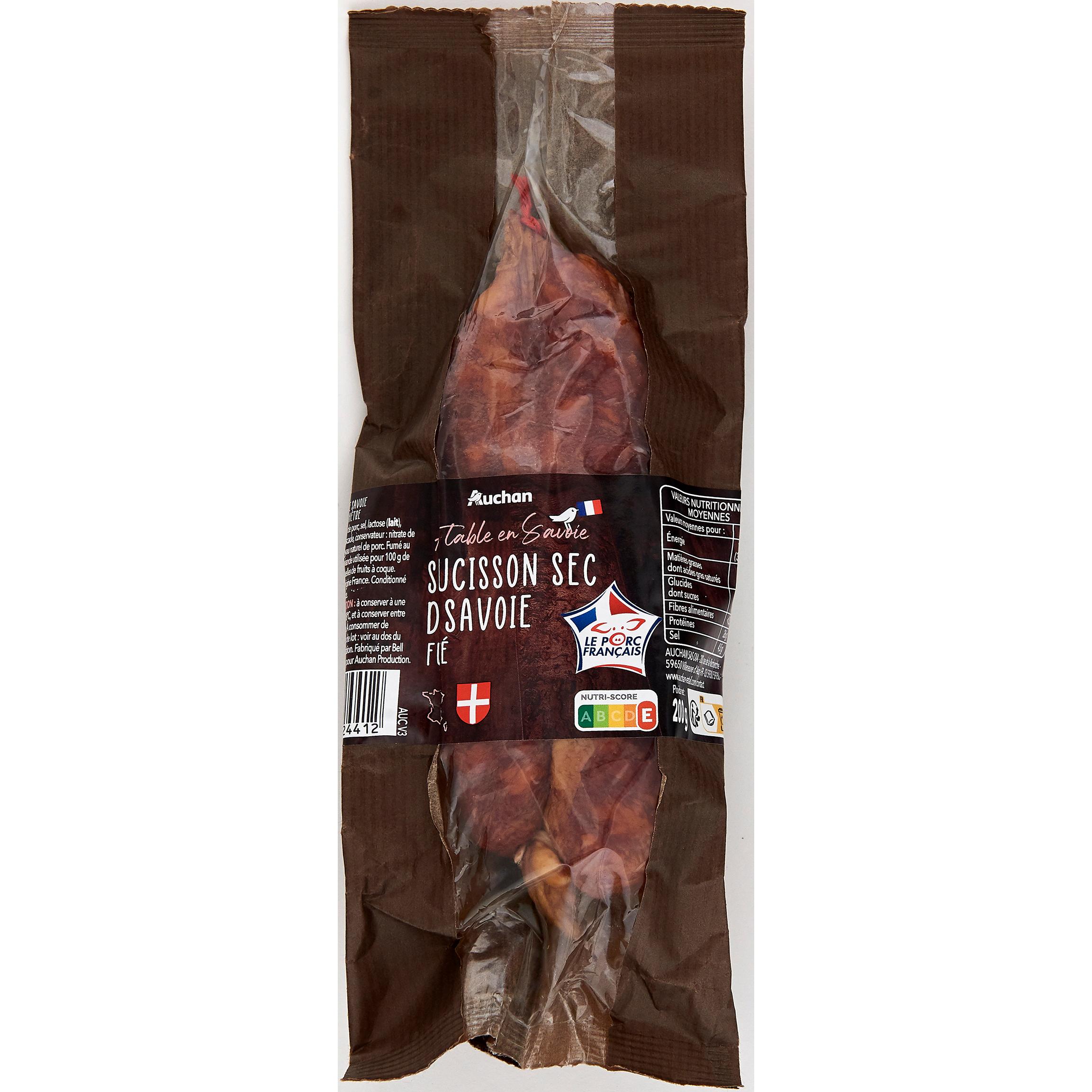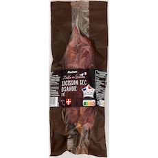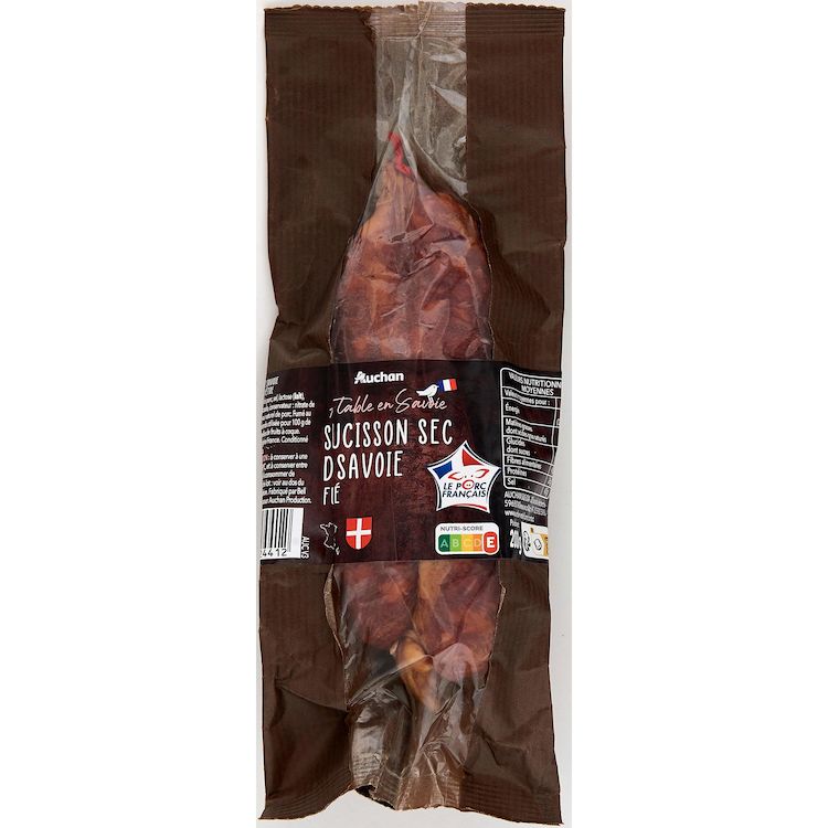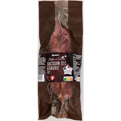 Saucisson sec de Savoie fumé fabriqué selon une recette traditionnelle à base de viande de porc origine France, une fumaison délicate, embossé dans un boyau naturel de porc et séché au cœur des Alpes pour un saucisson aux saveurs authentiques.
