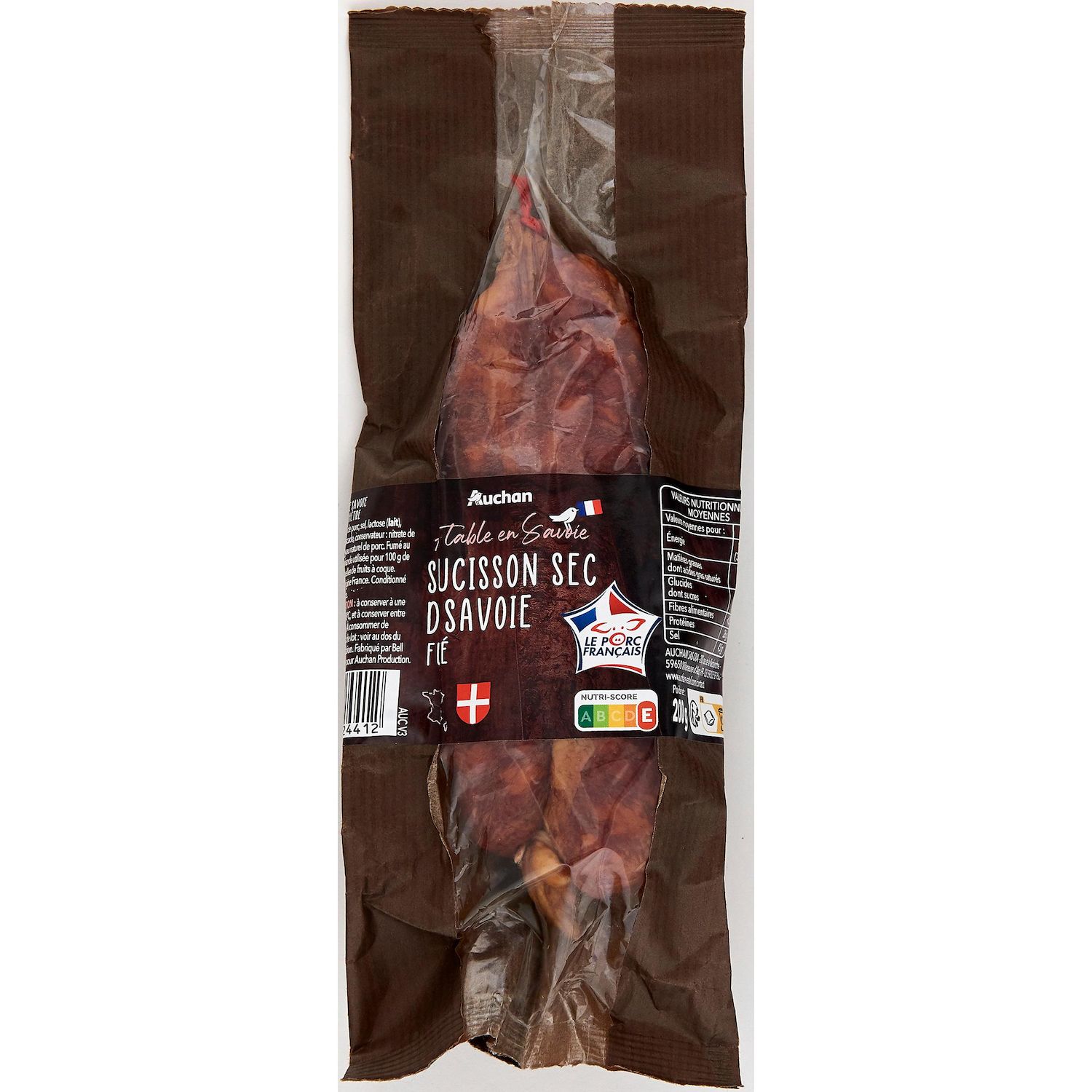 Ingrédients : viande de porc, sel, lactose (LAIT), dextrose, ail, poivre, muscade, conservateur: nitrate de potassium, ferments. Boyau naturel de porc.Fumé au bois de hêtre.148 g de viande utilisée pour 100 g de produit fini.Traces éventuelles de fruits à coque. Elaboré à partir de porc origine France