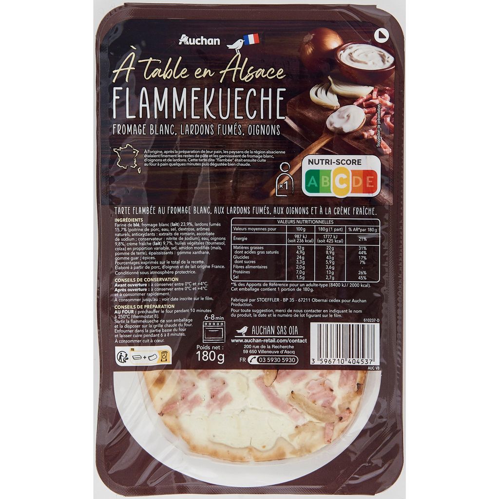 Ingrédients : Farine de BLÉ, fromage blanc (LAIT) 23,9%, lardons fumés 15,7% (poitrine de porc, eau, sel, dextrose, arômes naturels, antioxydants : extraits de romarin, ascorbate de sodium conservateur : nitrite de sodium), eau, oignons 9,8%, crème fraîche (LAIT) 9,7% huiles végétales (tournesol, colza) en proportion variable, sel, amidon modifiés (maïs, pomme de terre), épaississants : gomme xanthane, gomme guar épices. Pourcentages exprimés sur le total de la recette. Elaboré à partir de porc, d'oignon et de lait origine France.
