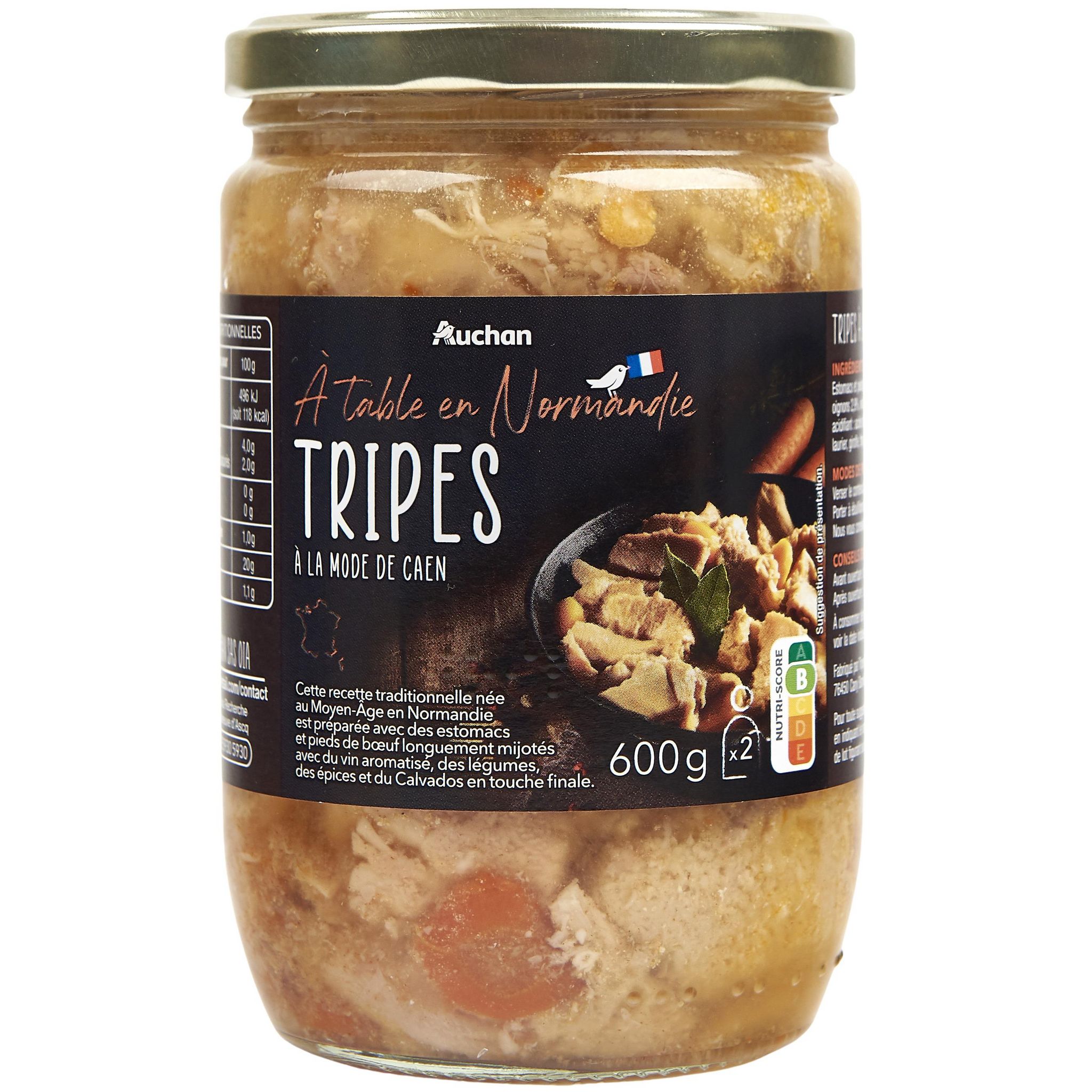 Ingrédients : Estomacs et pieds de bœuf (origine France) 70,5%, eau, carottes (3,7%), oignons (2,9%), vin aromatisé, sel, Calvados, maltodextrine, piment doux, acidifiant : acide citrique, extraits d'épices et de plantes aromatiques (poivre, laurier, girofle, thym, piment), ail