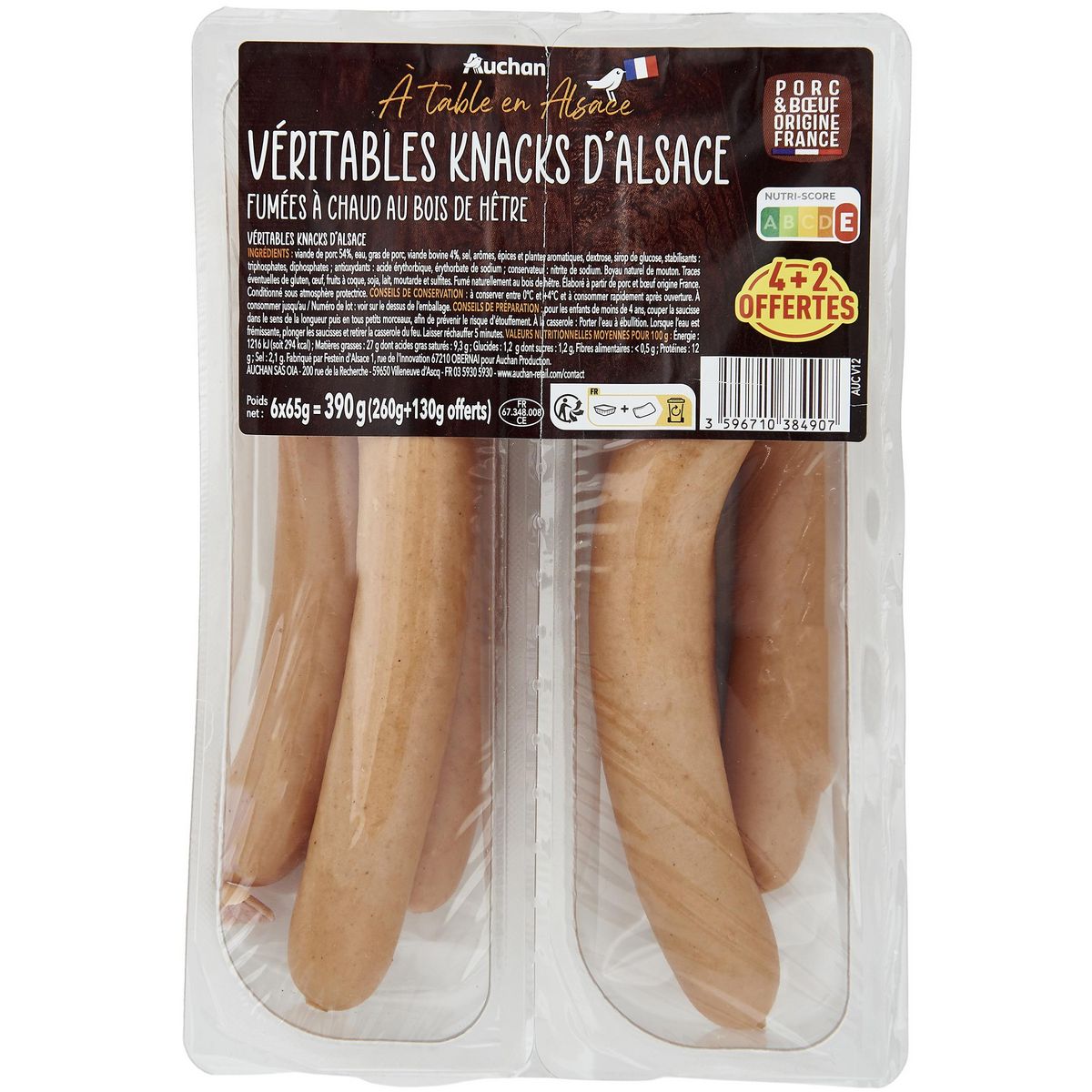 "ette spécialité alsacienne est à base de viande de porc, ainsi que de viande bovine et est assaisonnée avec différentes épices.Cette charcuterie à pate fine est cuite puis fumée à chaud au bois de hêtre, ce qui donne à sa chair la couleur brune. Facile et un régal pour toute la famille!Pour éviter qu'elles n'éclatent, plongez les knacks dans l'eau frémissante - 70°C - pendant 10 minutes. Les knacks sont délicieuses seules servies avec moutarde et pain. Elles peuvent aussi être accompagnées de choucroute, salades, frites et purées..."